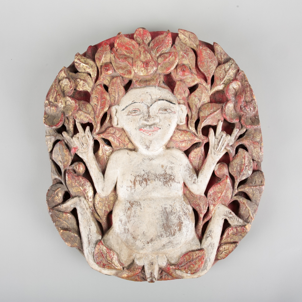 19th/20th century, carved in relief with a naked and jovial figure amongst gilt foliage, 40cm high x 35cm wide x 4cm deep