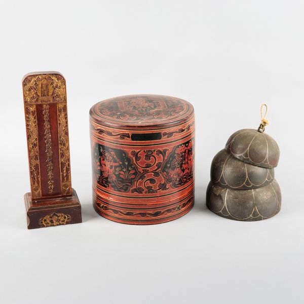 inscribed to the front with characters within dragon borders, opening to reveal further ink inscriptions, 29.5cm high; together with a Burmese lacquer Betel box, of cylindrical form, decorated with figural vignettes, 21cm high; and a graduated set of hanging temple bells, the largest 15cm diameter (3)