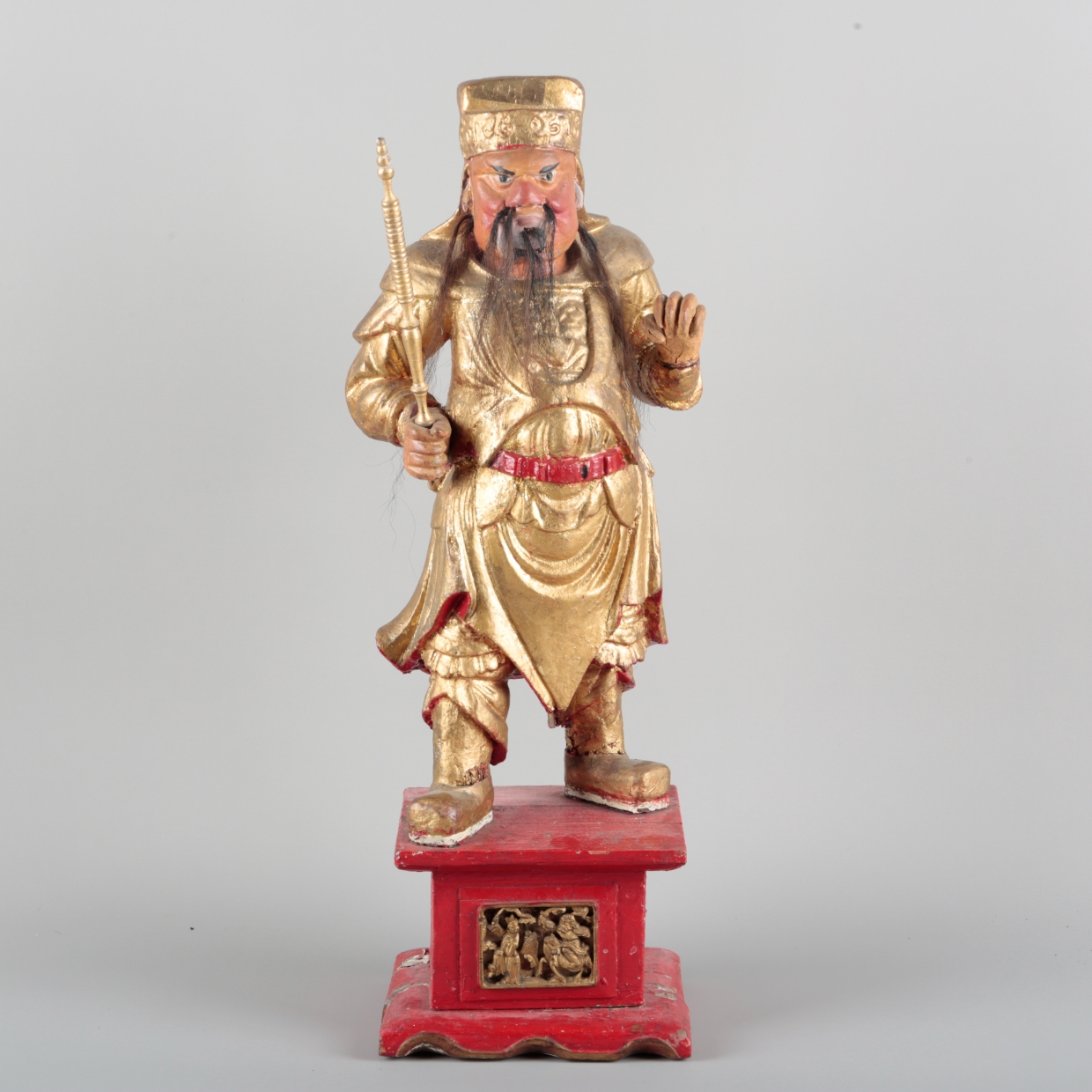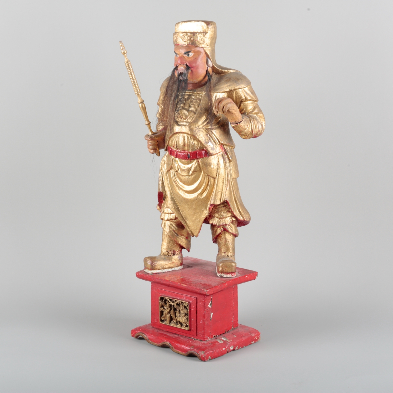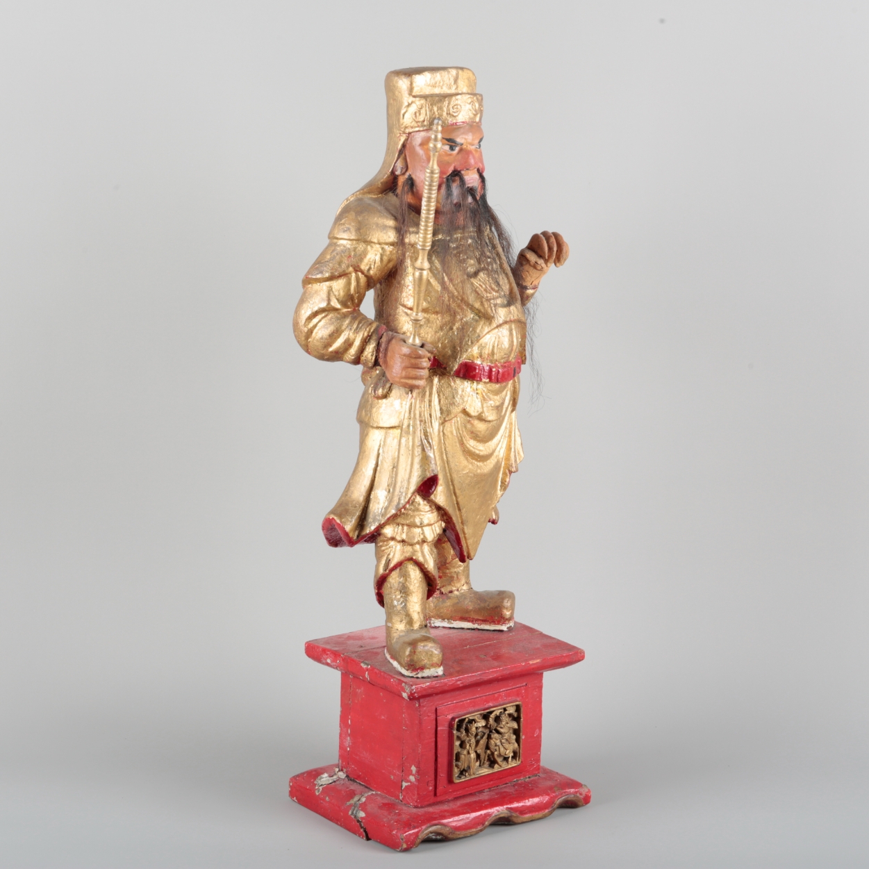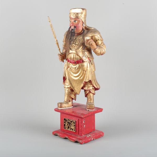 late Qing/20th century, modelled standing upon a rectangular pedestal base inset with a carved giltwood panel, 62cm high