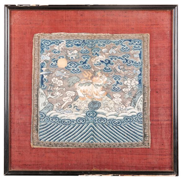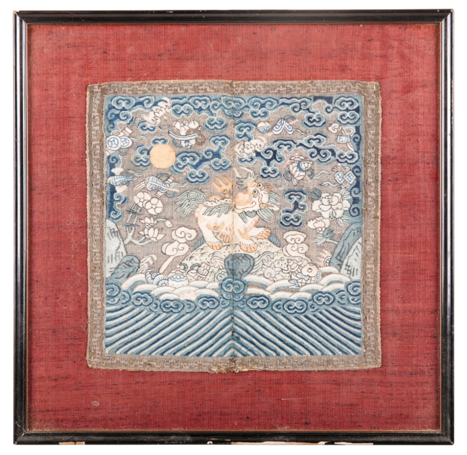 Qing dynasty, each badge embroidered with the one horned mythical beast Xiezhi centred on a mound, the Eight Buddhist Emblems Bajixiang flying above, a band of waves to the base, 28.5cm high x 29.5cm wide, mounted and framed (2)
