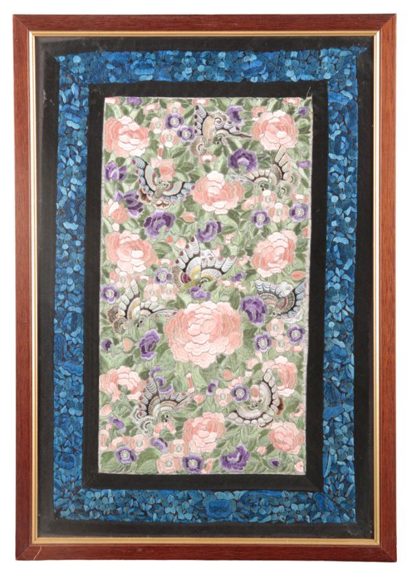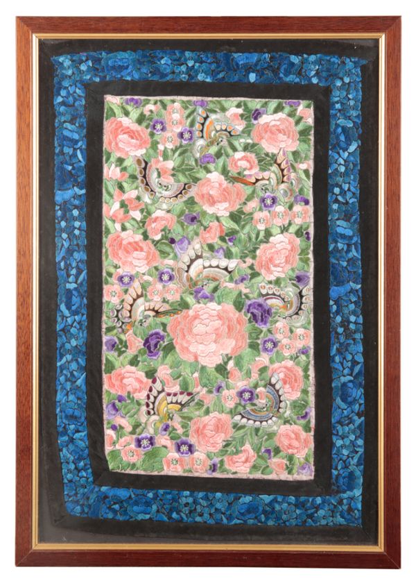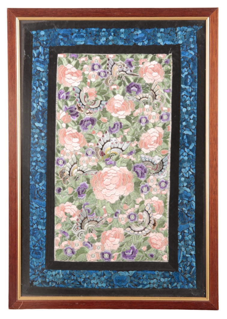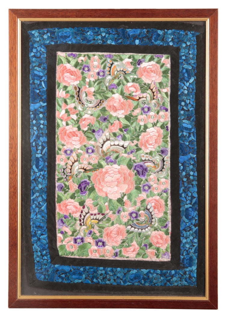A note to the reverse of the frames is inscribed: 'This piece of Chinese silk embroidery and its companion is said to have come from a Mandarins coat. It was acquired by the Roberts family late in the nineteenth century and was to be converted by Nima (my grandmother), Jessie and Grace, into a ladies waistcoat...'