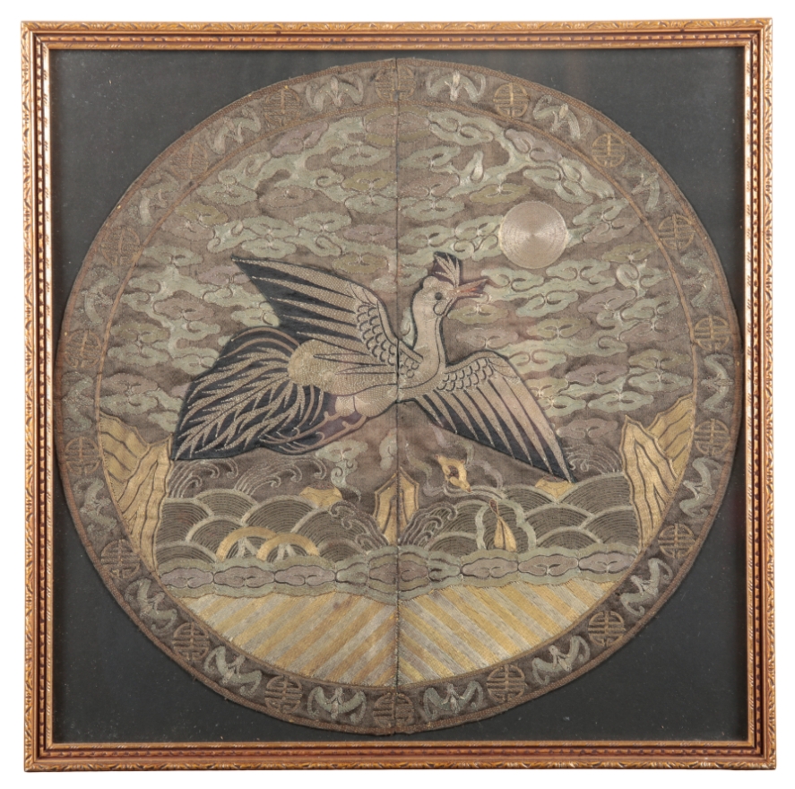 late Qing dynasty, of circular form, depicting a bird in flight above waves, 30cm diameter, mounted and framed; together with a pair of Chinese textile sleeve panels, 46cm high x 31cm wide (3)