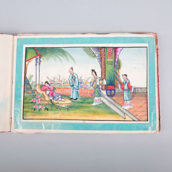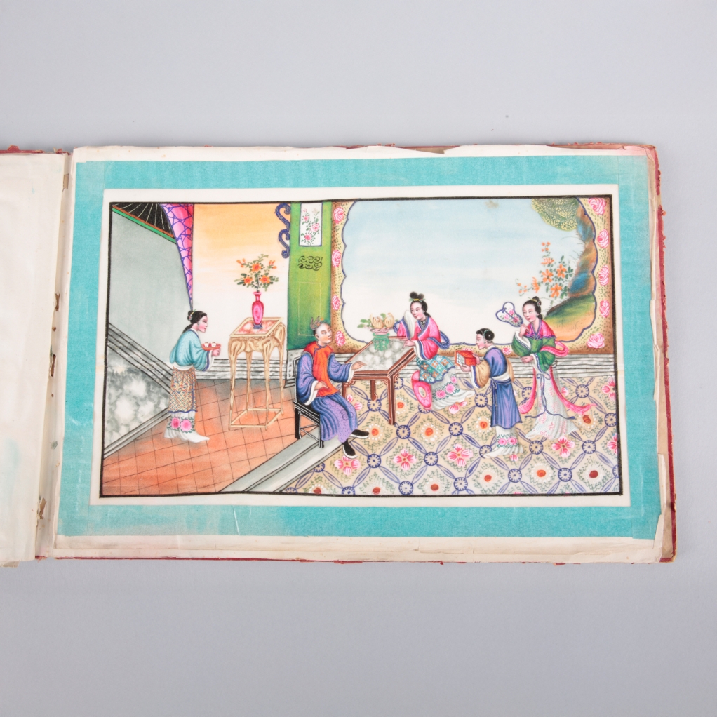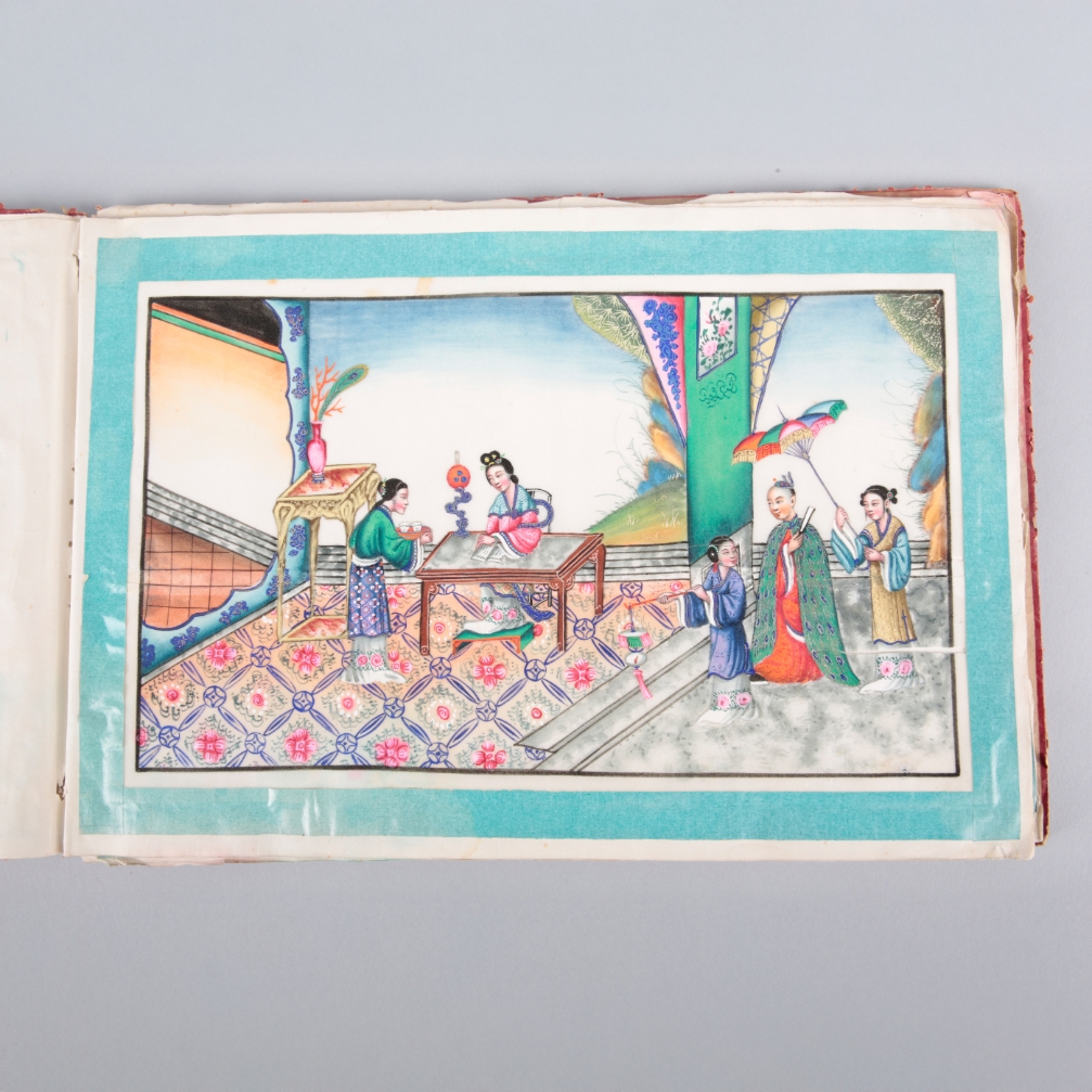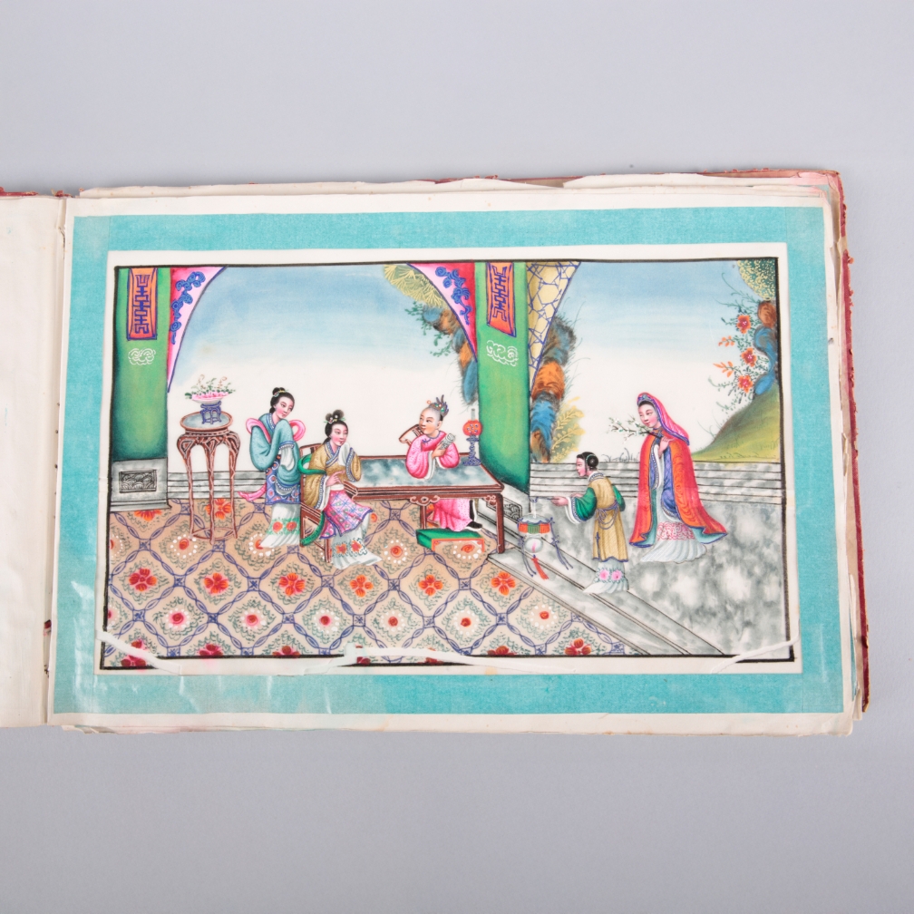 Qing dynasty, mounted in a bound volume, the front page inscribed in English 'Ten Chinese rice paper paintings "A Prince and Princess at home"', each image depicting figures in a lavish setting, often with attendants, each c.19cm high x 32cm wide