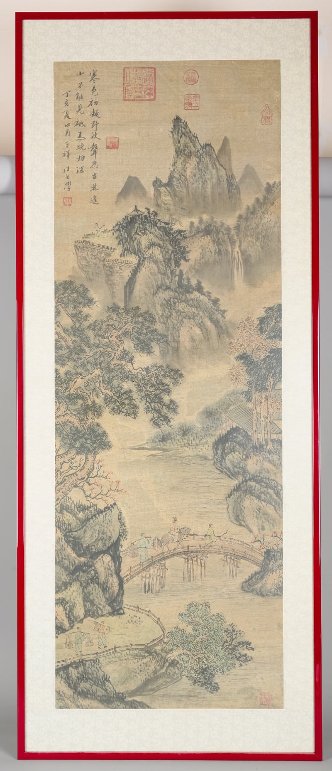 signed and inscribed upper left and bearing multiple seal marks, depicting figures on a bridge to the foreground, pagodas, trees, rivers and waterfalls, 123cm high x 43cm wide