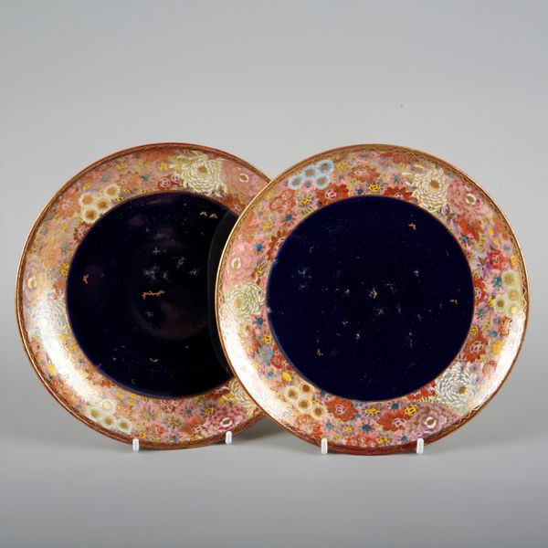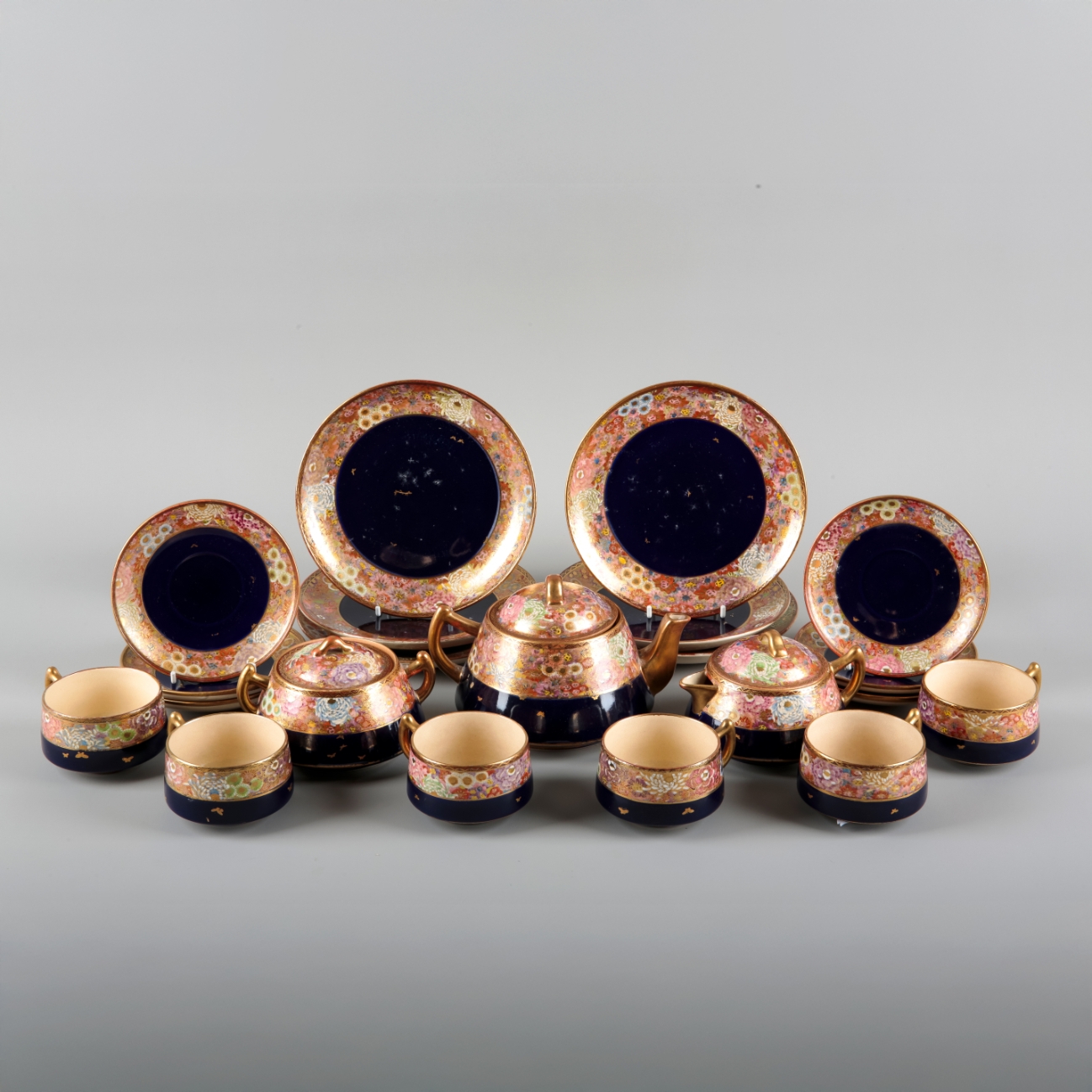 Meiji, of cobalt blue ground with scattered gilt butterflies, decorated with kiku and flowers highlighted in gold to the outer edges, composed of six cups and saucers, a teapot and cover, a sugar bowl and cover, a milk jug with cover, and six side plates, the teapot 12cm high x 18cm long x 14.5cm diameter (24)