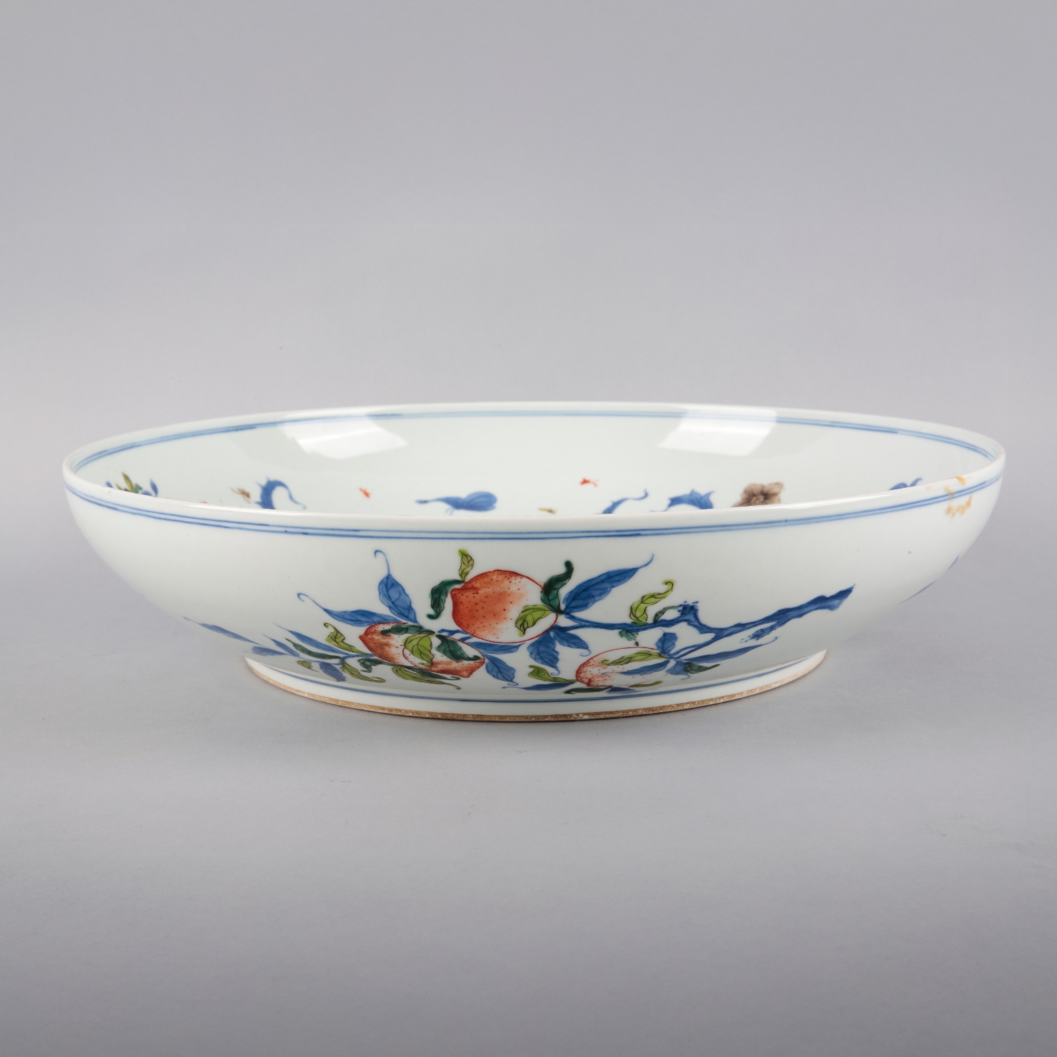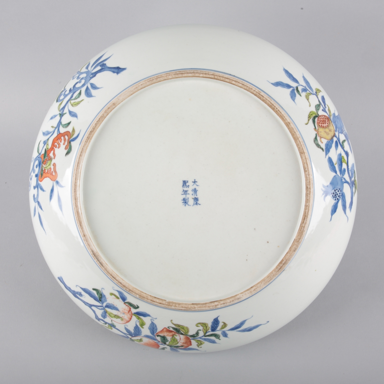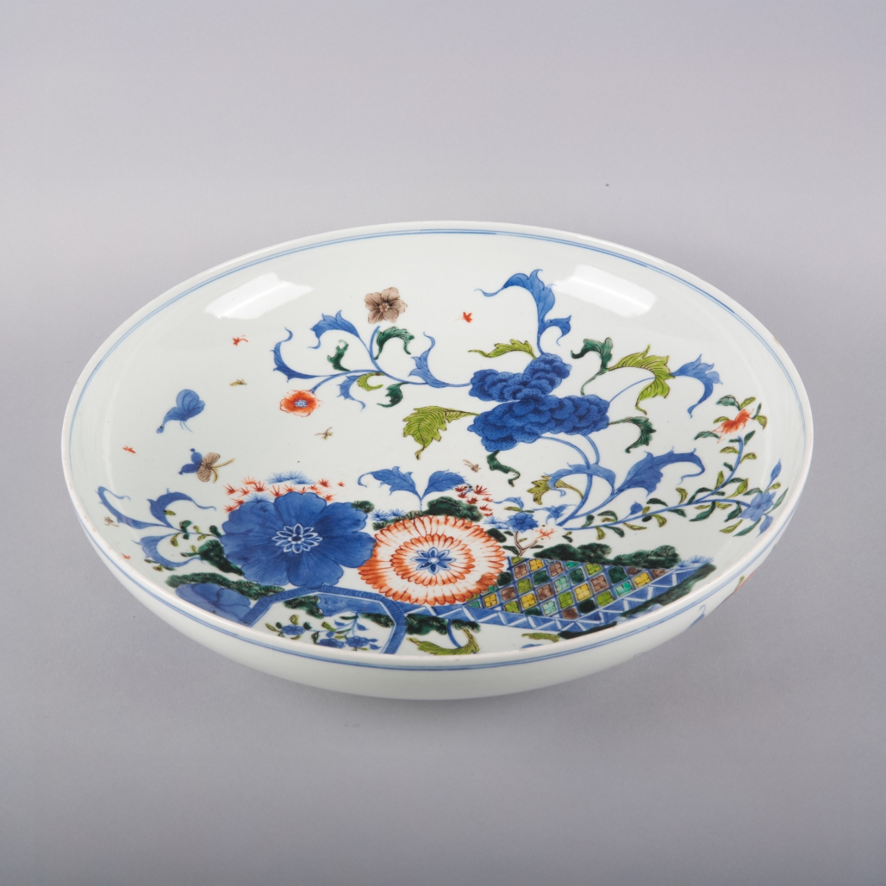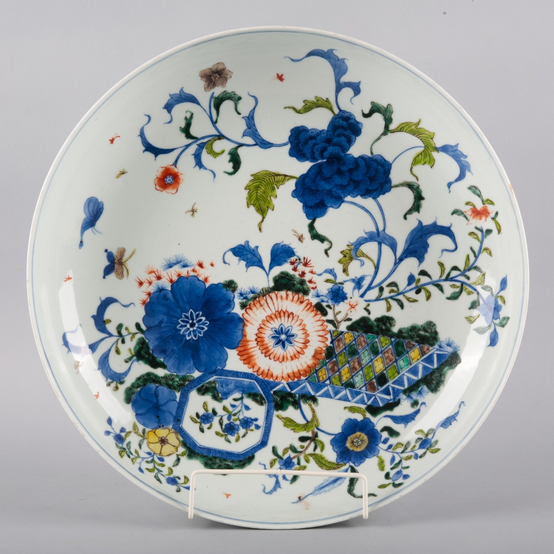 bearing a six character Kangxi mark to the base, decorated in underglaze blue, red and enamels with insects flying amongst blossoming peonies, 9cm high x 40cm diameter