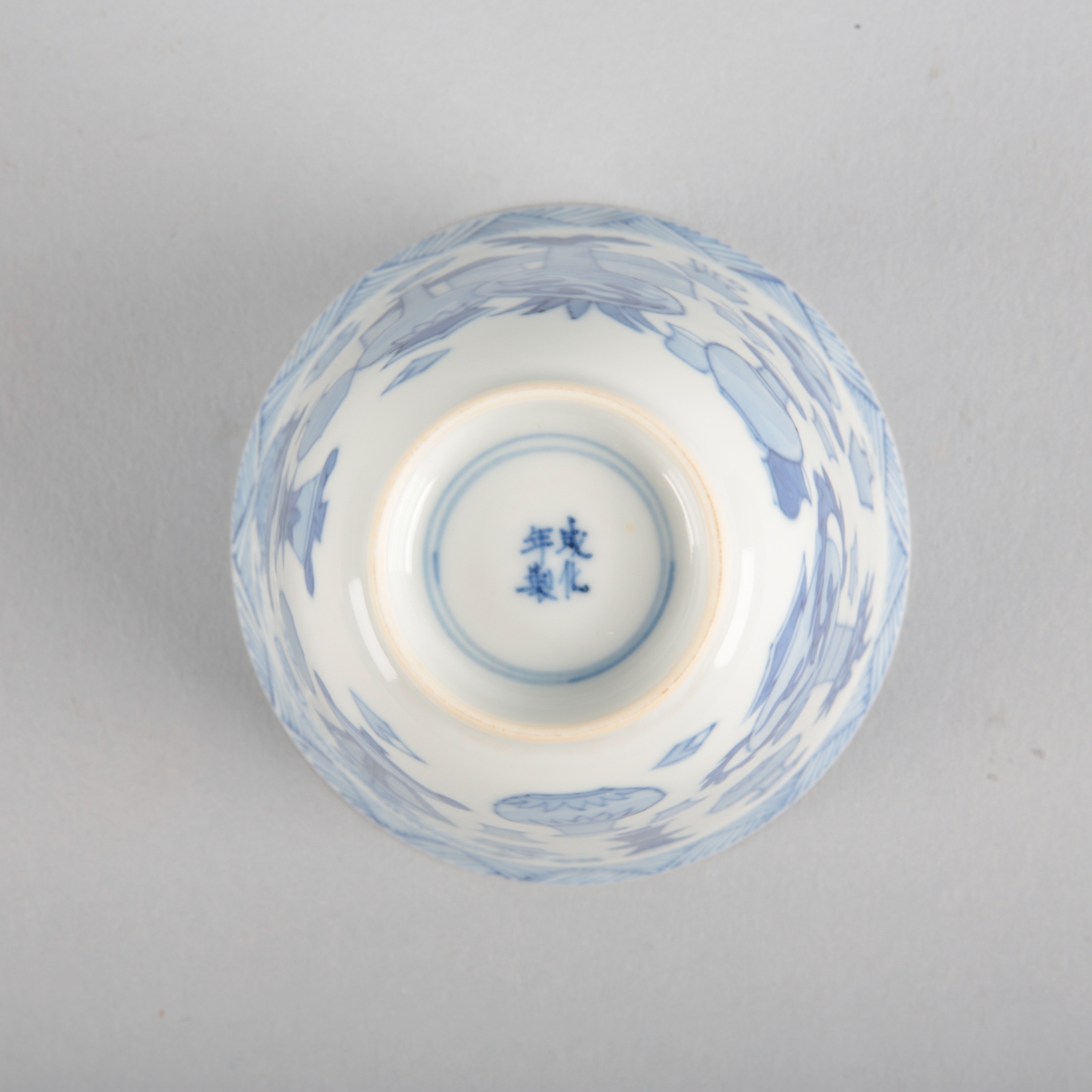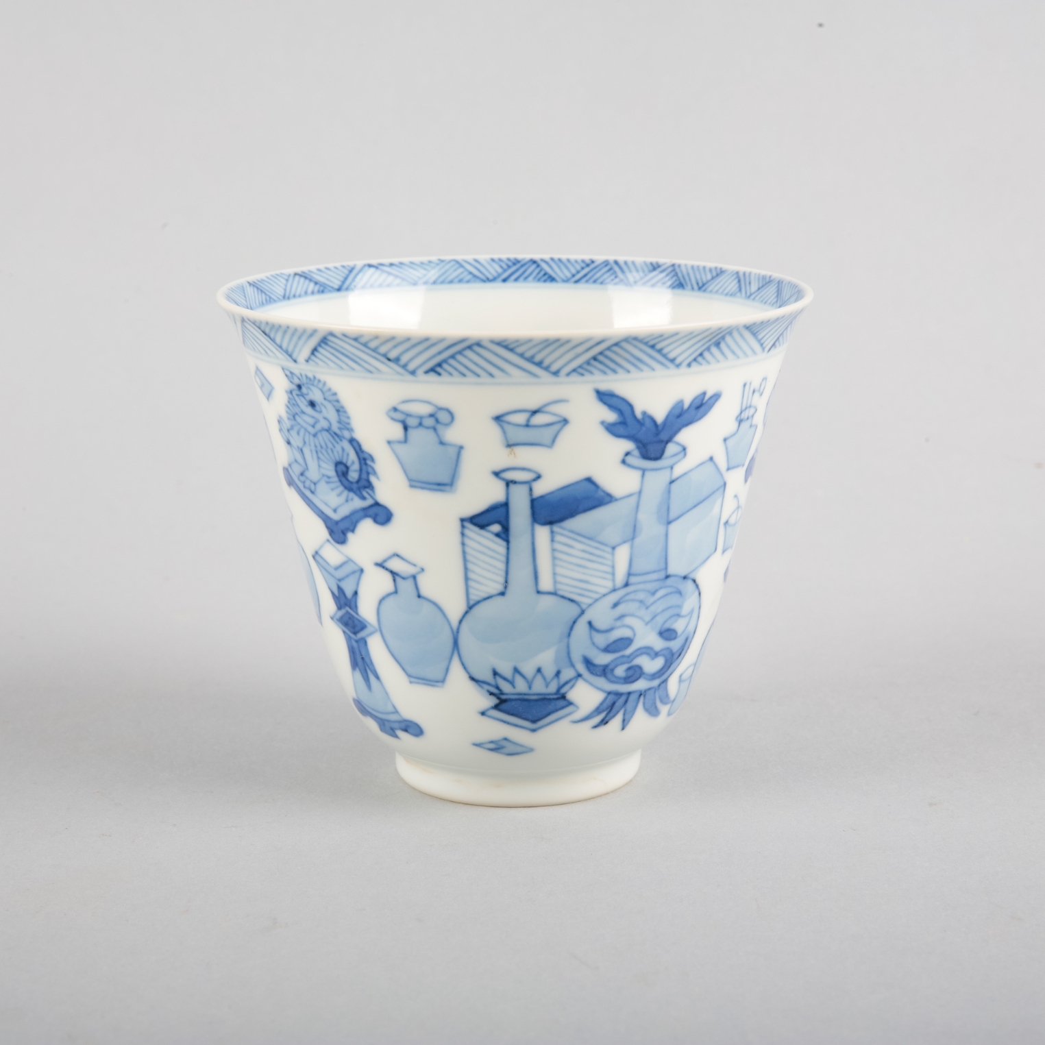 bearing four character Chenghua marks to the base however later, with everted rim, tapered body and raised foot, decorated in the 'hundred antiques' pattern, the interior of the bowl with a spray of flowers, 7.5cm high x 8cm diameter (5)