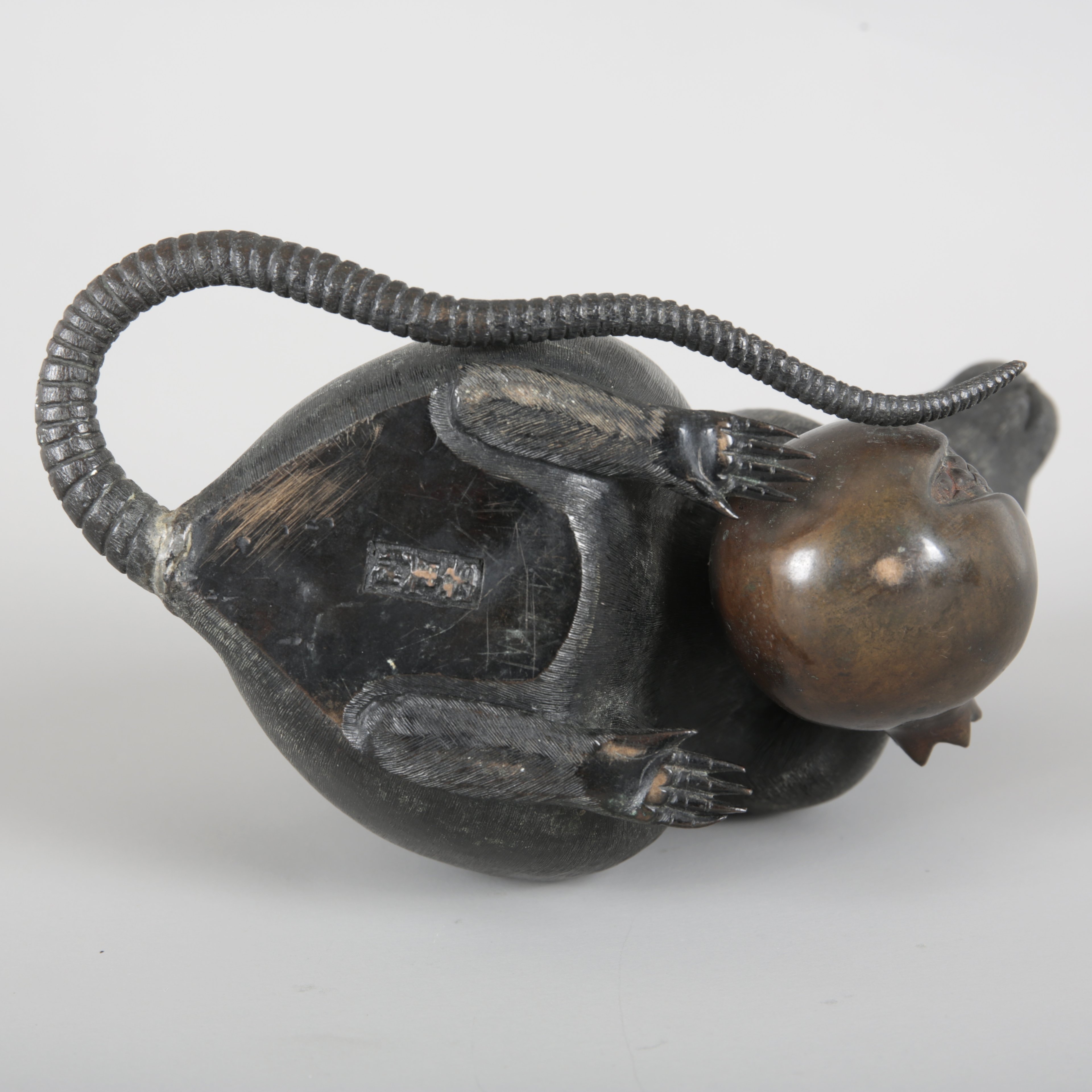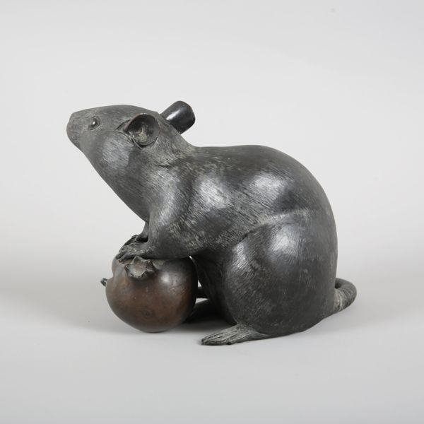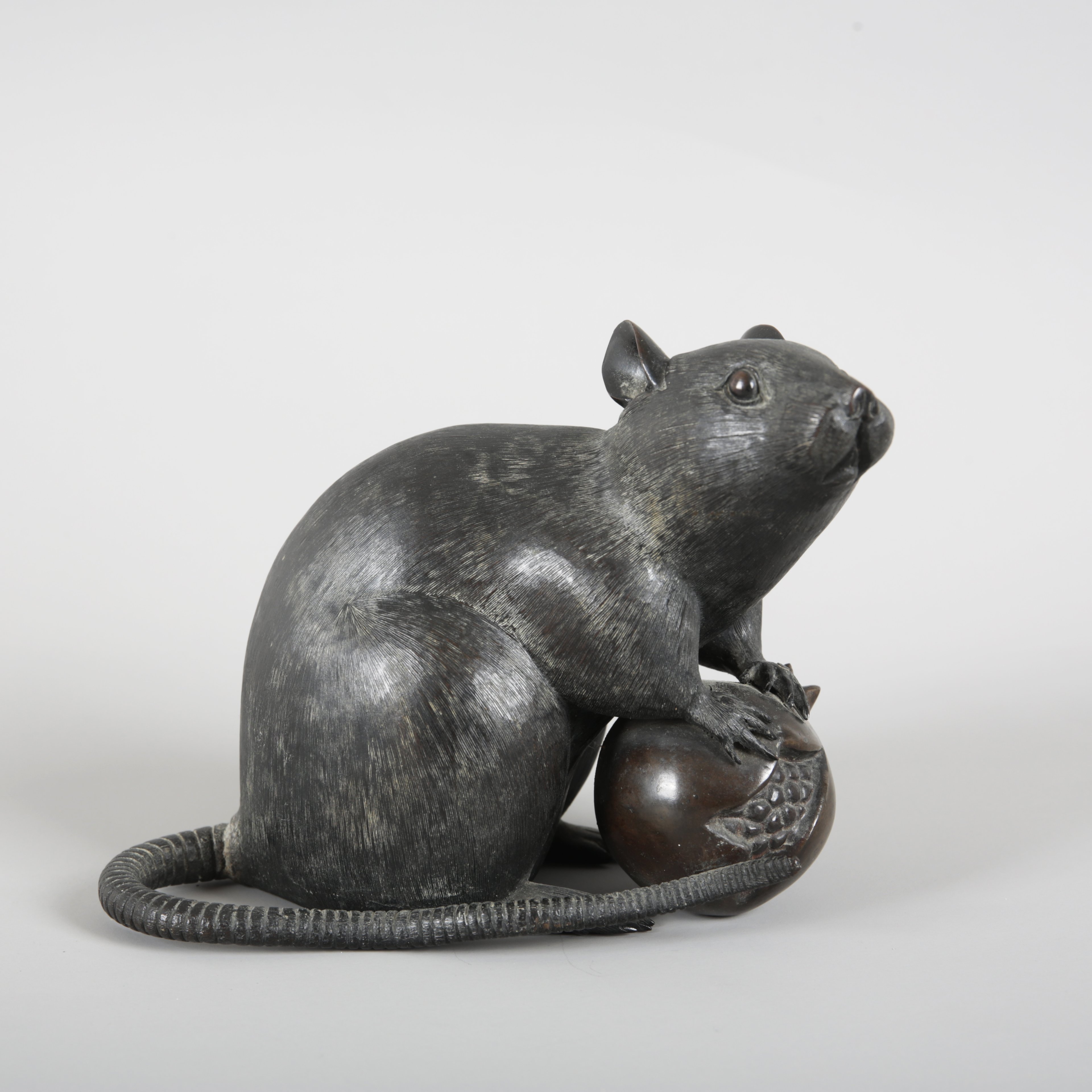 The bronze rat sculpture is in good overall condition with minor wear consistent with age and handling. There appears to be a welding repair at the joint where the body meets the tail, and light abrasions are visible on the base. Surface wear is scattered but unobtrusive. Additional photos available on request.