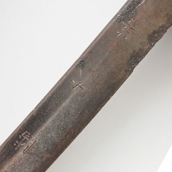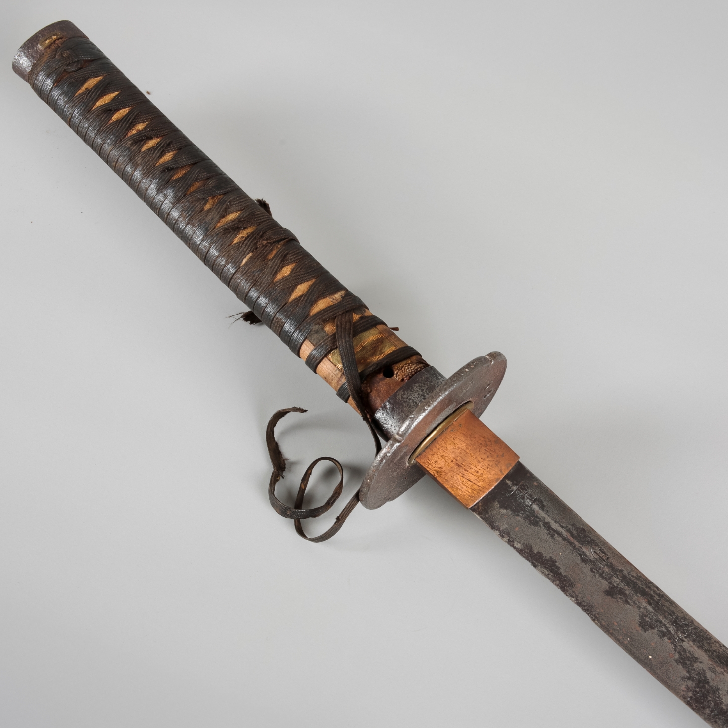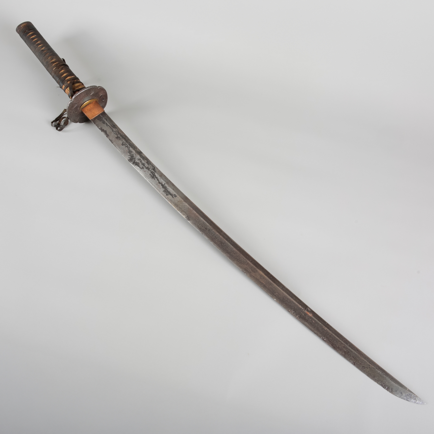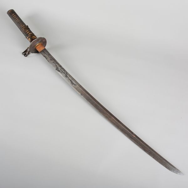 There is considerable tarnishing to the blade and metal features, including the tsuba.