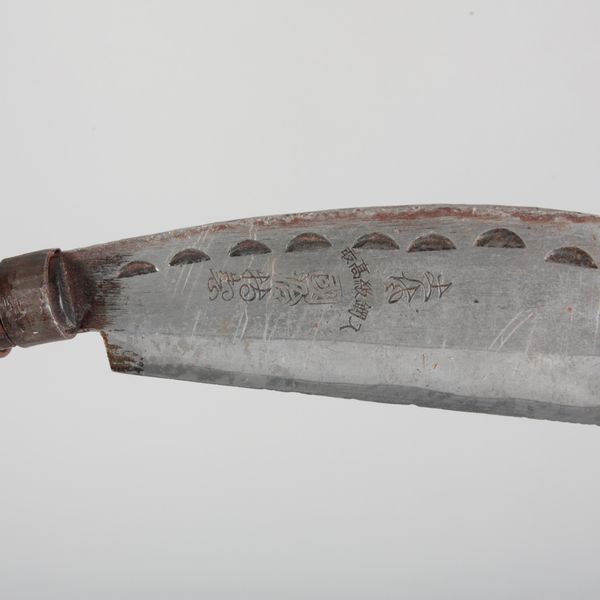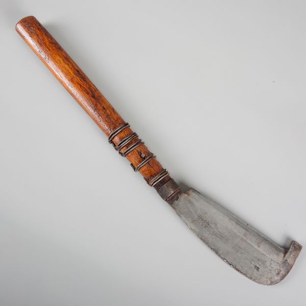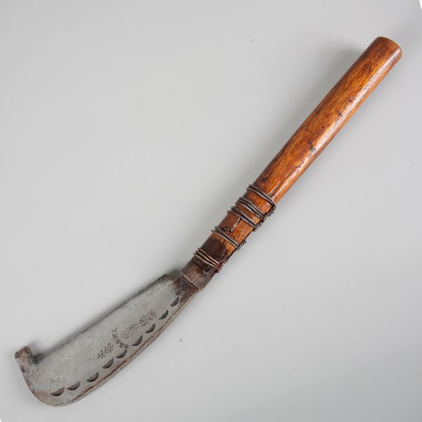 20th century, signed and inscribed to the hooked blade, with a turned wood tapered handle, 49.5cm long; together with a bronze ritual knife, probably Tibetan with a triangular blade and turned handle, 37cm long (2)