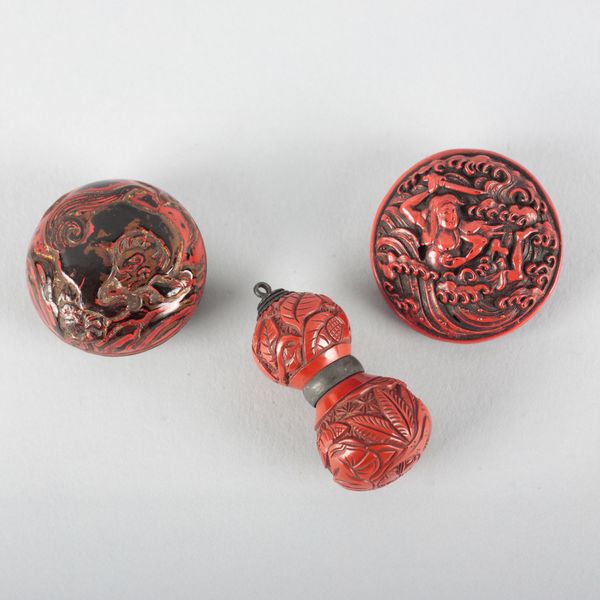 TWO SIMILAR JAPANESE RED LACQUERED MANJU NETSUKES