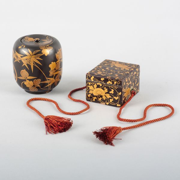 Edo period, including a Natsume, decorated in gilt with flowers and foliage, 6.5cm high; and a box and cover, decorated similarly with trailing foliage, affixed with two cord ties, 3.5cm high x 5.5cm wide (2)