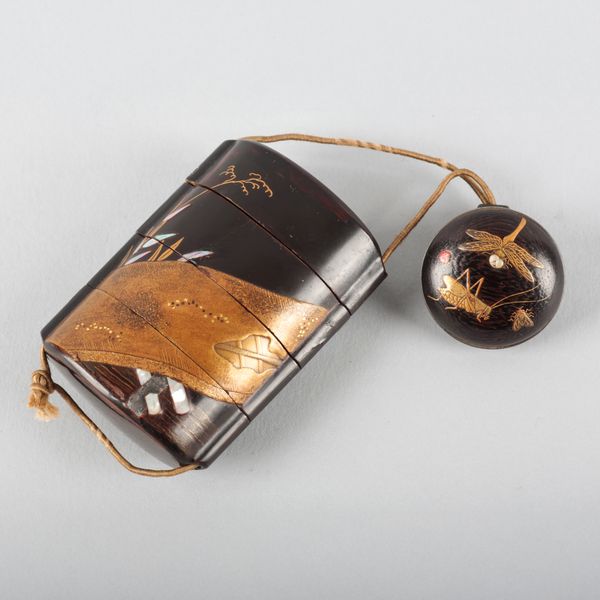 inscribed in gilt to the base, decorated in gilt and inset with mother of pearl, on one side with two bats in flight, the reverse with a landscape, inscribed 'Tsuchida Soetsu', 8cm high, complete with a square section ojime, finely carved with a figure, and a signed manju form netsuke, decorated with various insects, possibly inscribed 'Toyo', 3.5cm diameter