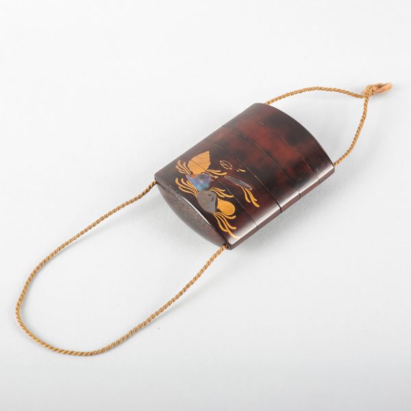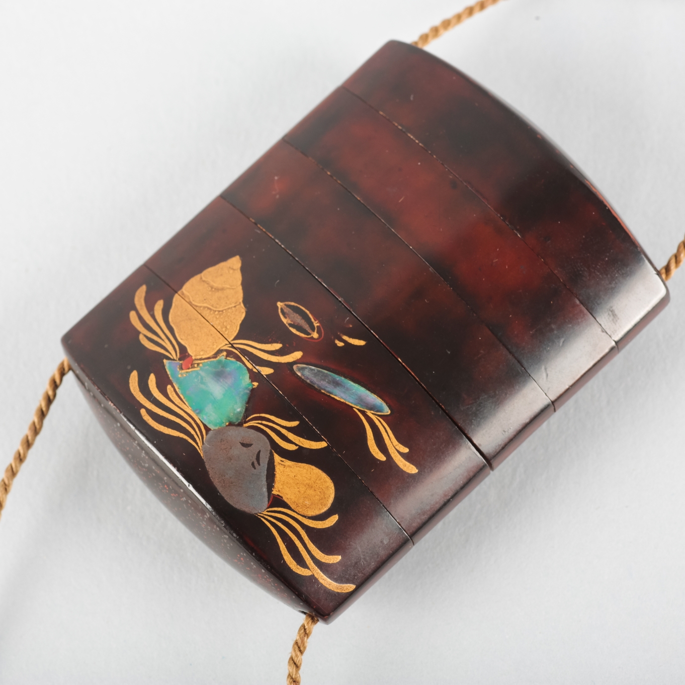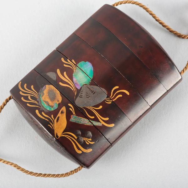 The inro appears to be in good order. One can observe the expected surface wear throughout commensurate with age. There are small abrasions to the edges to some corners and to the interior rims although this is in line with use. There are some scratches to the inlaid decoration.