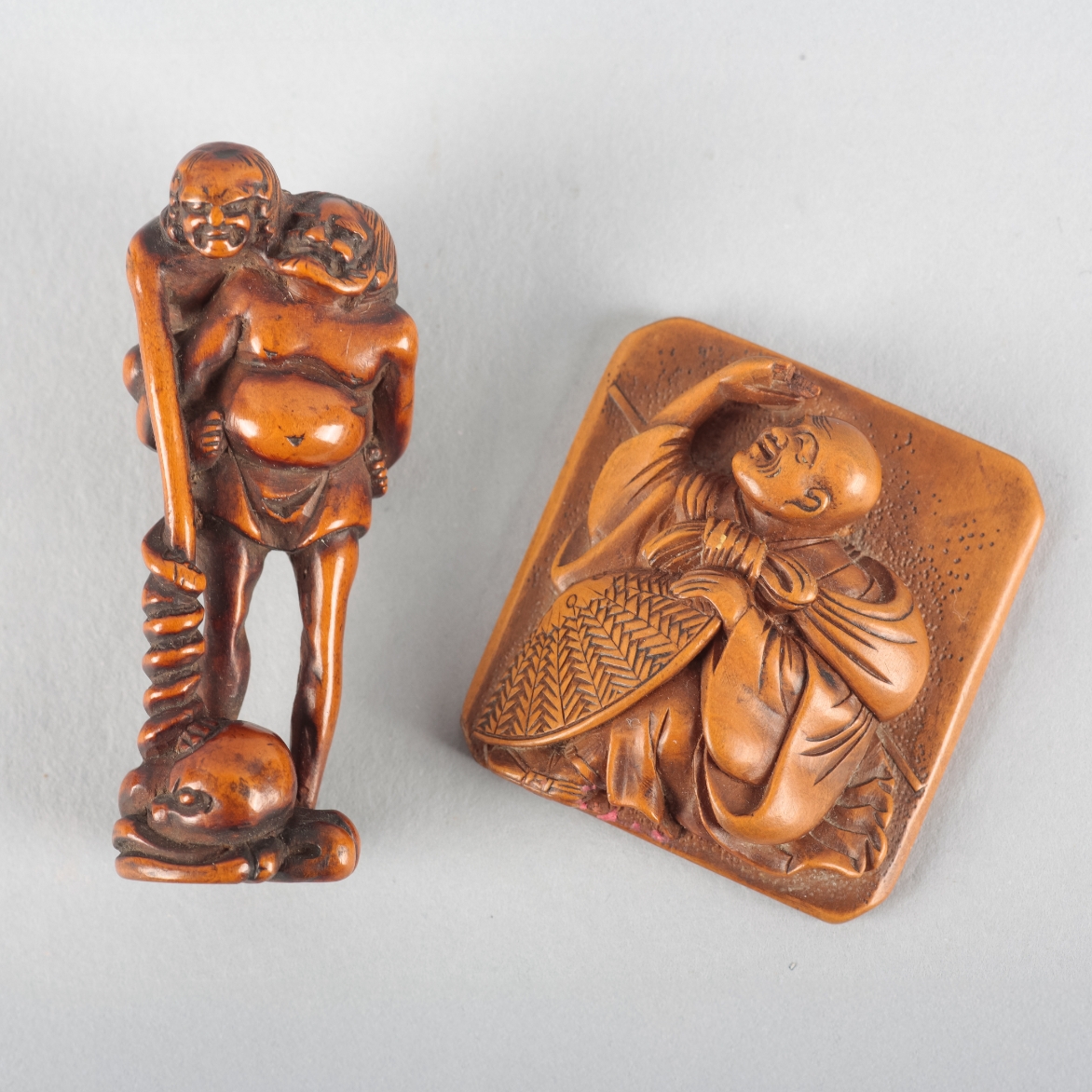Edo period, modelled as Ashinaga carrying Tenaga, who is attempting to grab an octopus coiled at his friends feet, 5.5cm high; together with another similar netsuke, of square 'manju' form, carved in relief with a seated man with his hat, 4cm high (2)