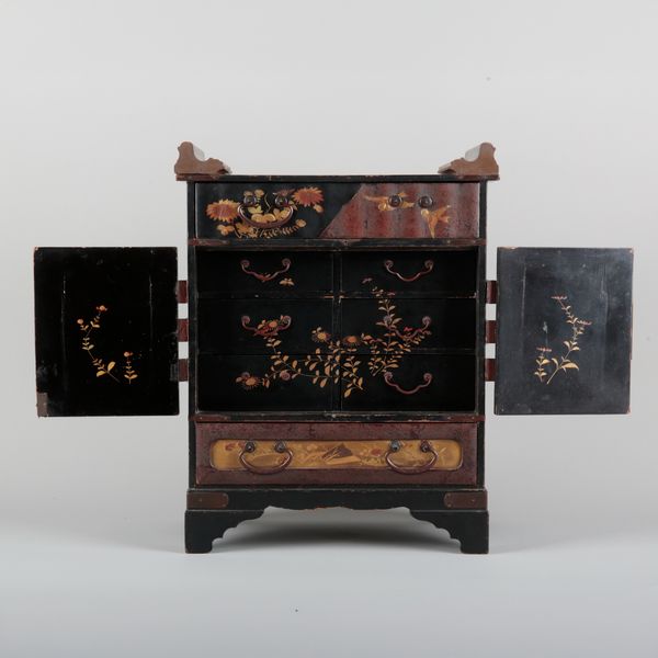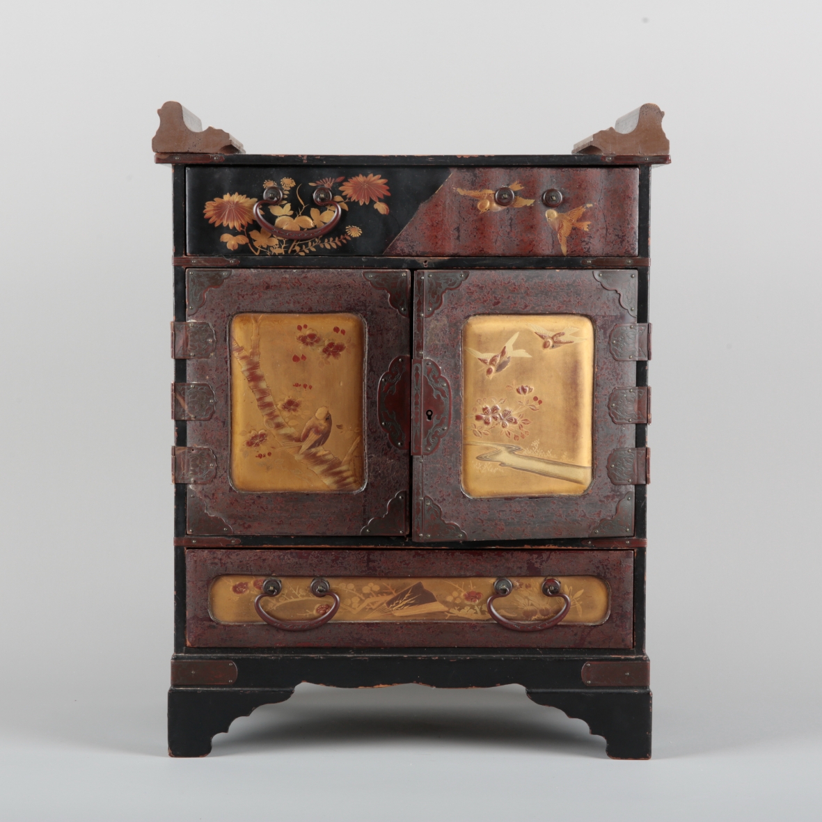 Meiji period/20th century, with a single frieze drawer over cupboards opening to short drawers, a further long drawer to the base, decorated throughout with birds, insect and foliage, 41cm high x 32cm wide