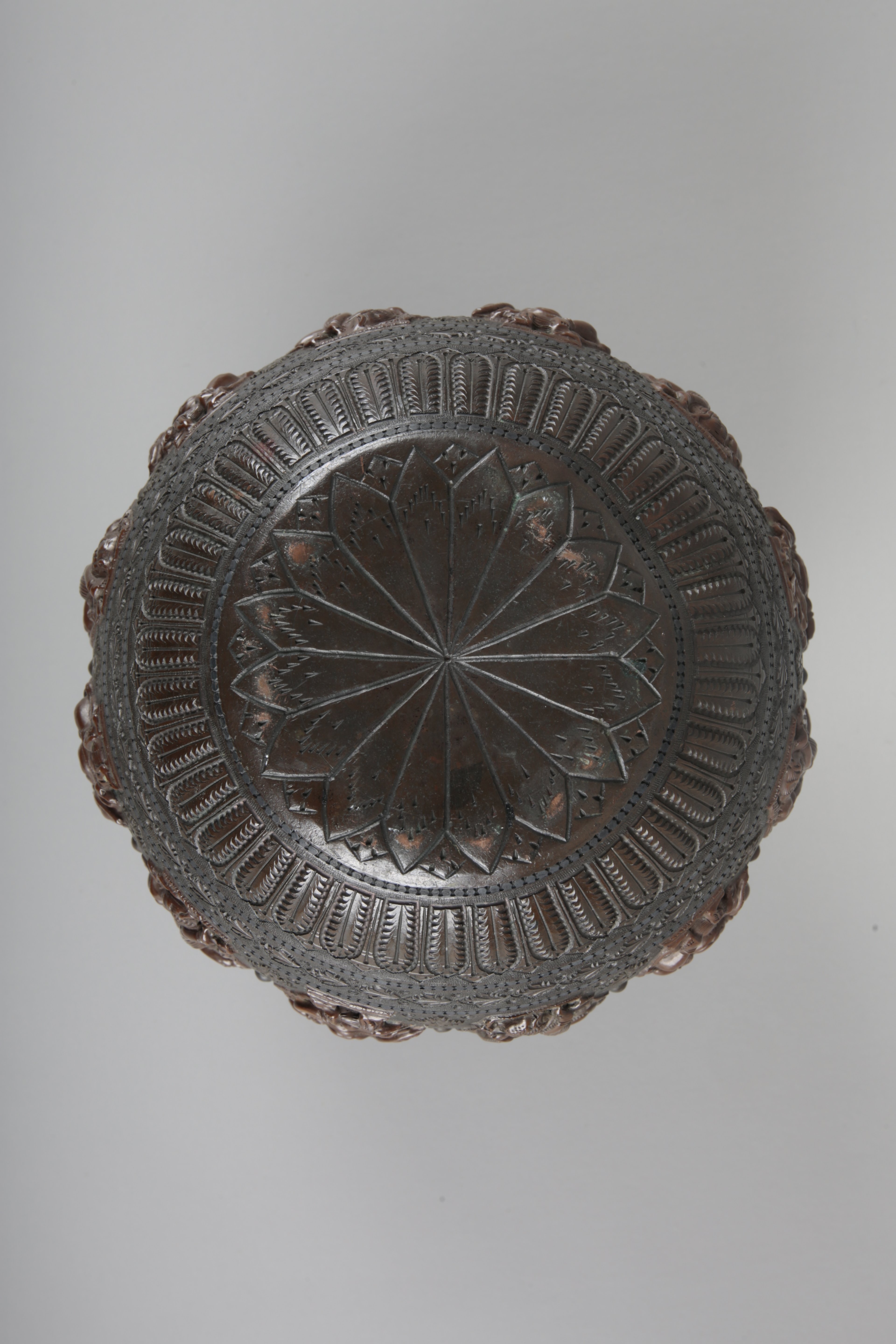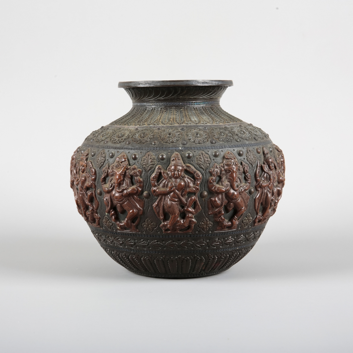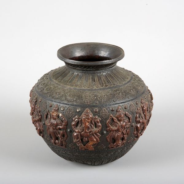 19th/20th century, decorated with alternating figures of Ganesh and Lakshmi, the gods of Diwali, 14cm high x 15cm diameter