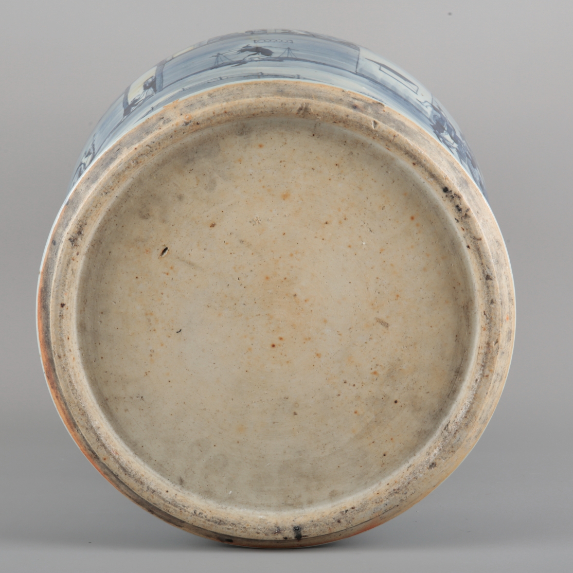19th century, decorated with a continuous landscape including figures on horseback, in a courtyard, and in a mountainous setting, 63cm high