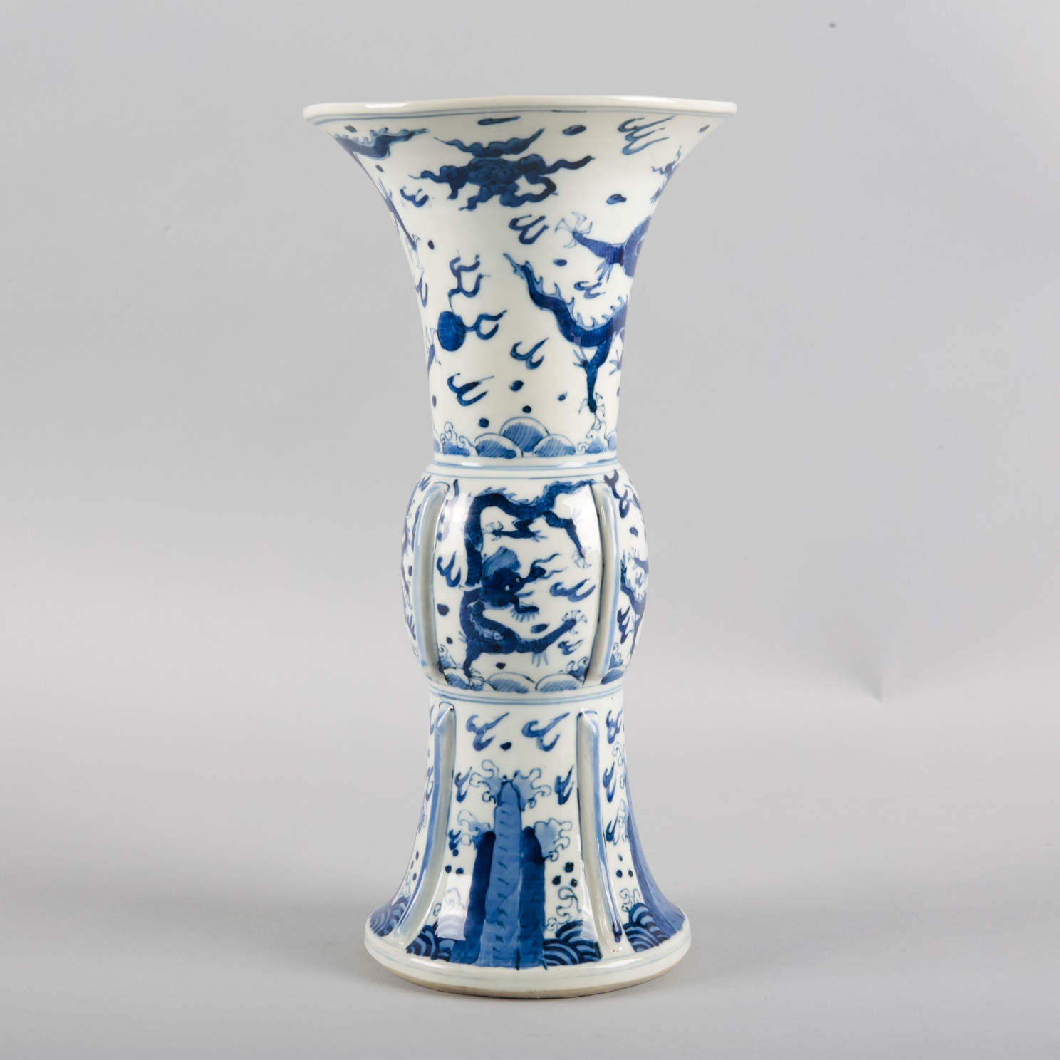 A CHINESE PORCELAIN BLUE AND WHITE 'DRAGON' GU VASE