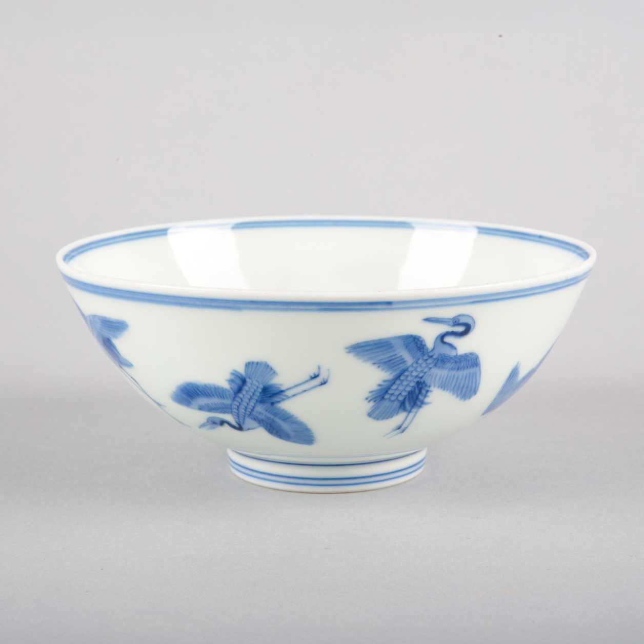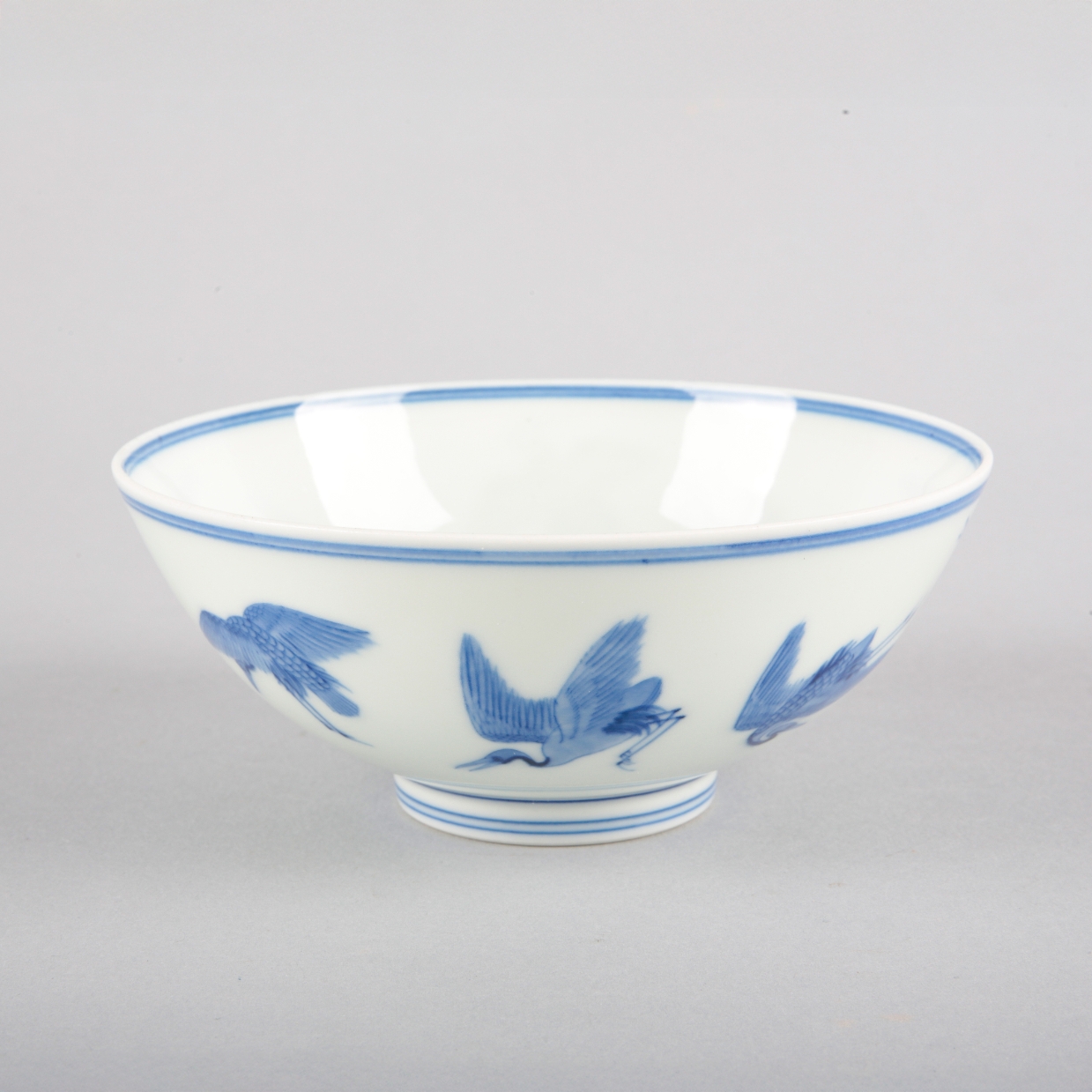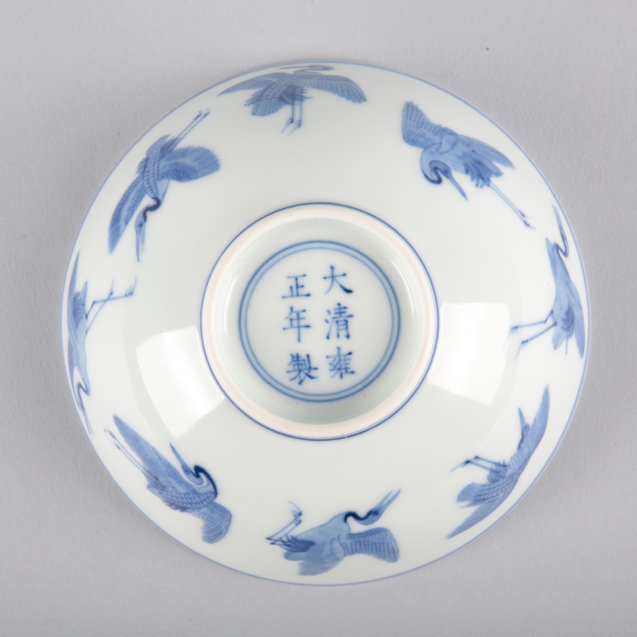 bearing a six character Yongzheng mark to the base, decorated with eight herons in flight, a blossoming pomegranate plant to the interior, 6cm high x 14.5cm diameter
