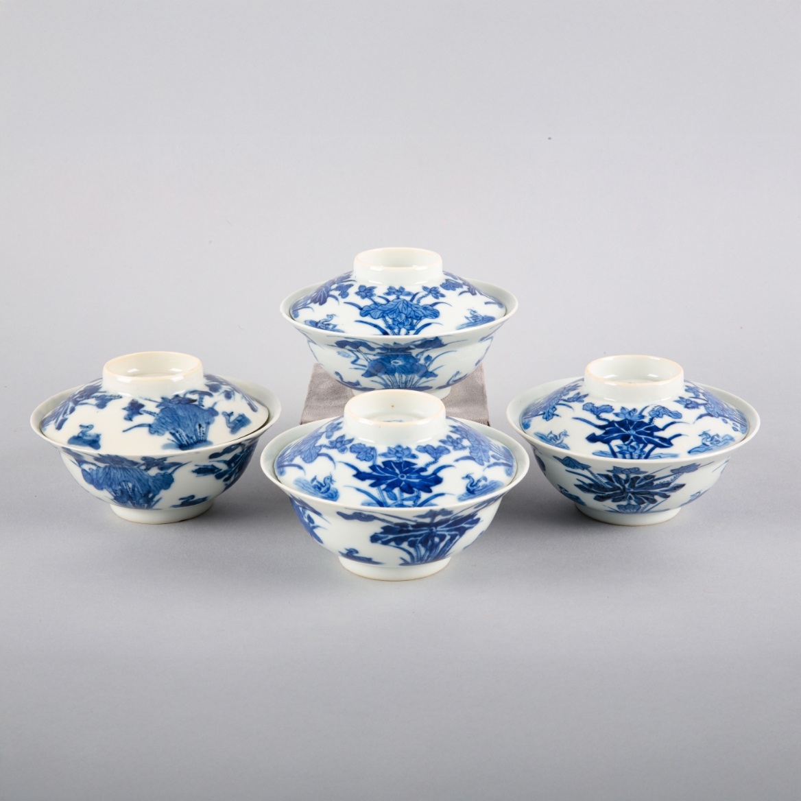 Small chips and fritting to the delicate edges of the rims throughout, to both bowls covers, tops and foot.