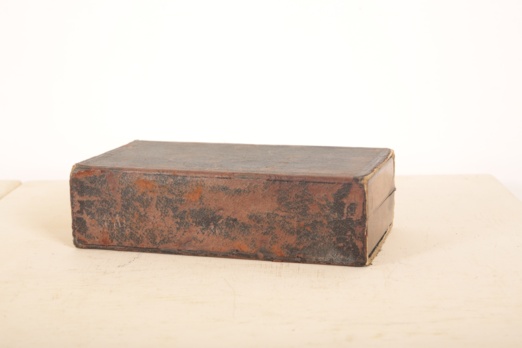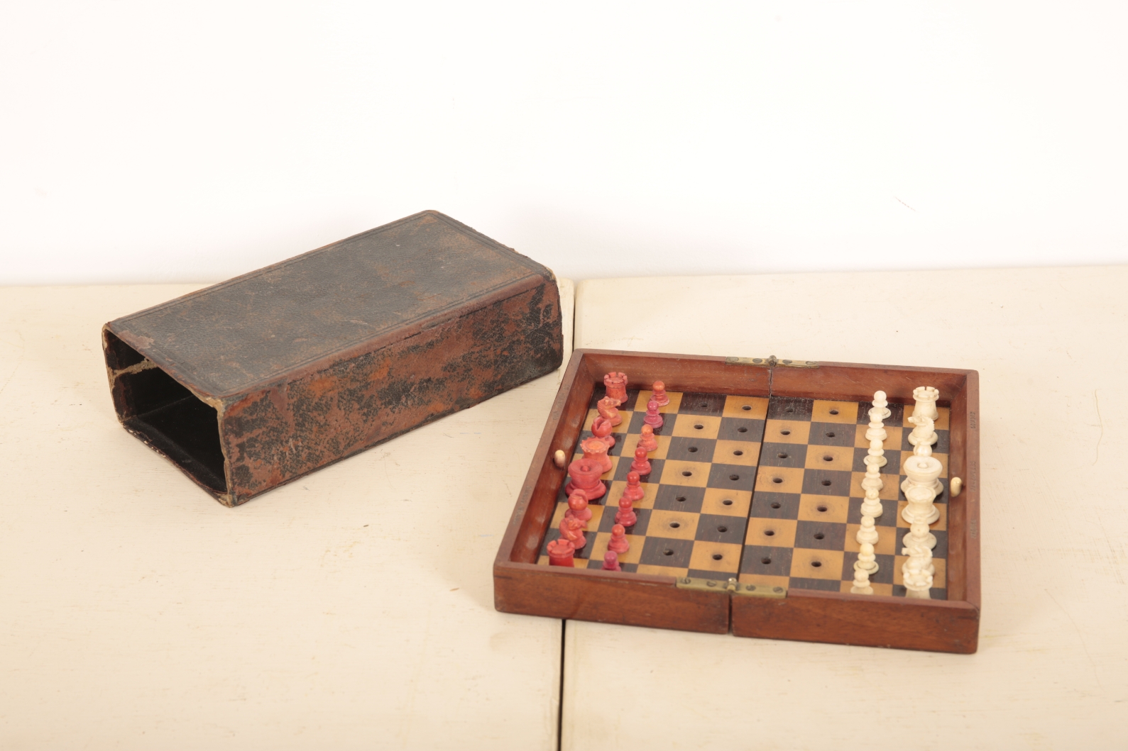 The item is in fair used condition. It bears surface marks to the leather travelling case and the box when closed. The mechanism is in working order. There is wear to each square where the piece would be placed. Some tarnishing to the brass hinges. Minor loss of colour to the pieces.