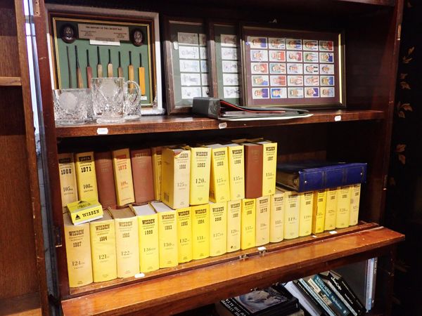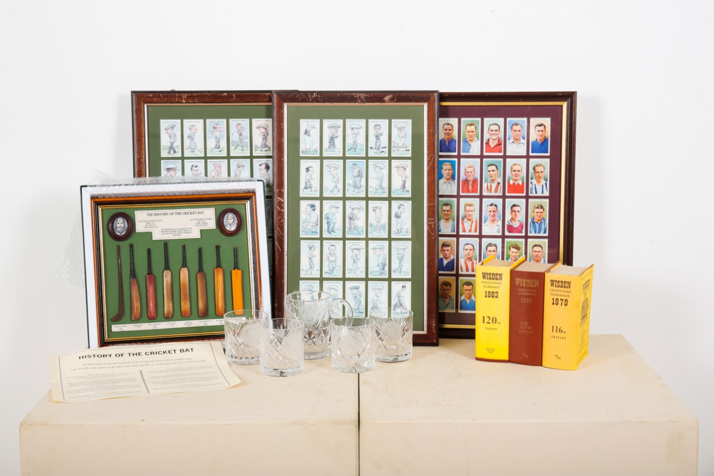 including examples from Churchman's and others, typically measuring 47cm high x 30cm wide; together with a framed evolution of the cricket bat, 26cm high x 30cm wide; a quantity of Wissen almanacs; and five Aston Villa glasses (a lot)