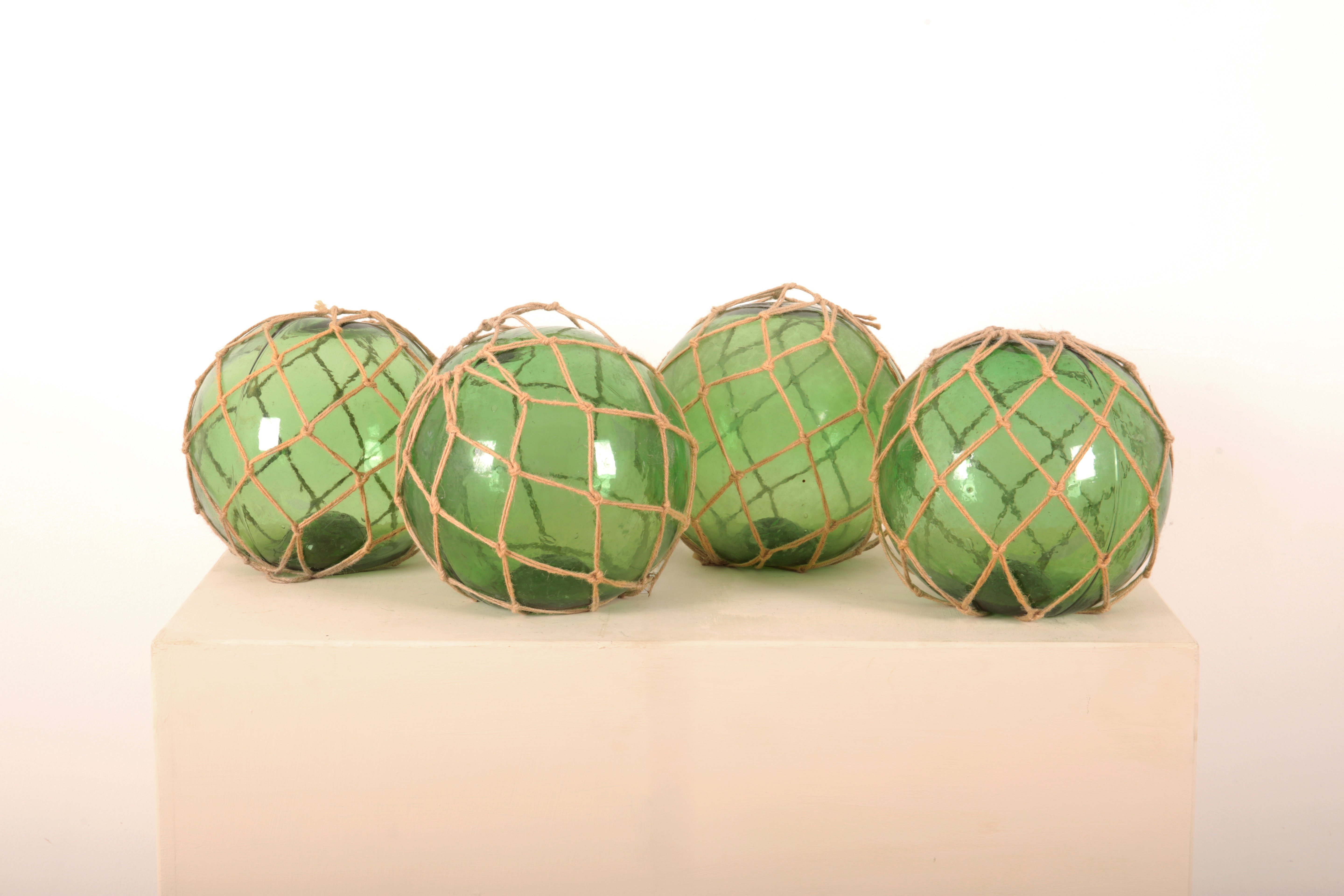 FOUR LARGE GREEN BLOWN GLASS FLOTATION BUOYS
