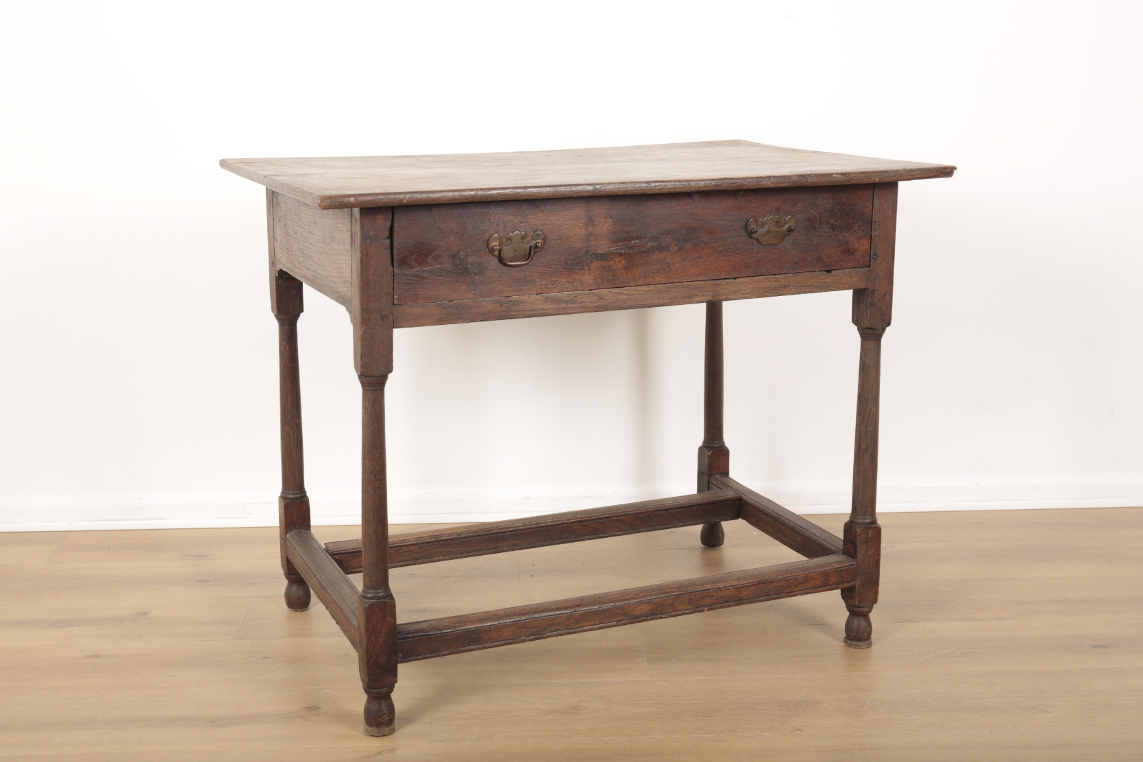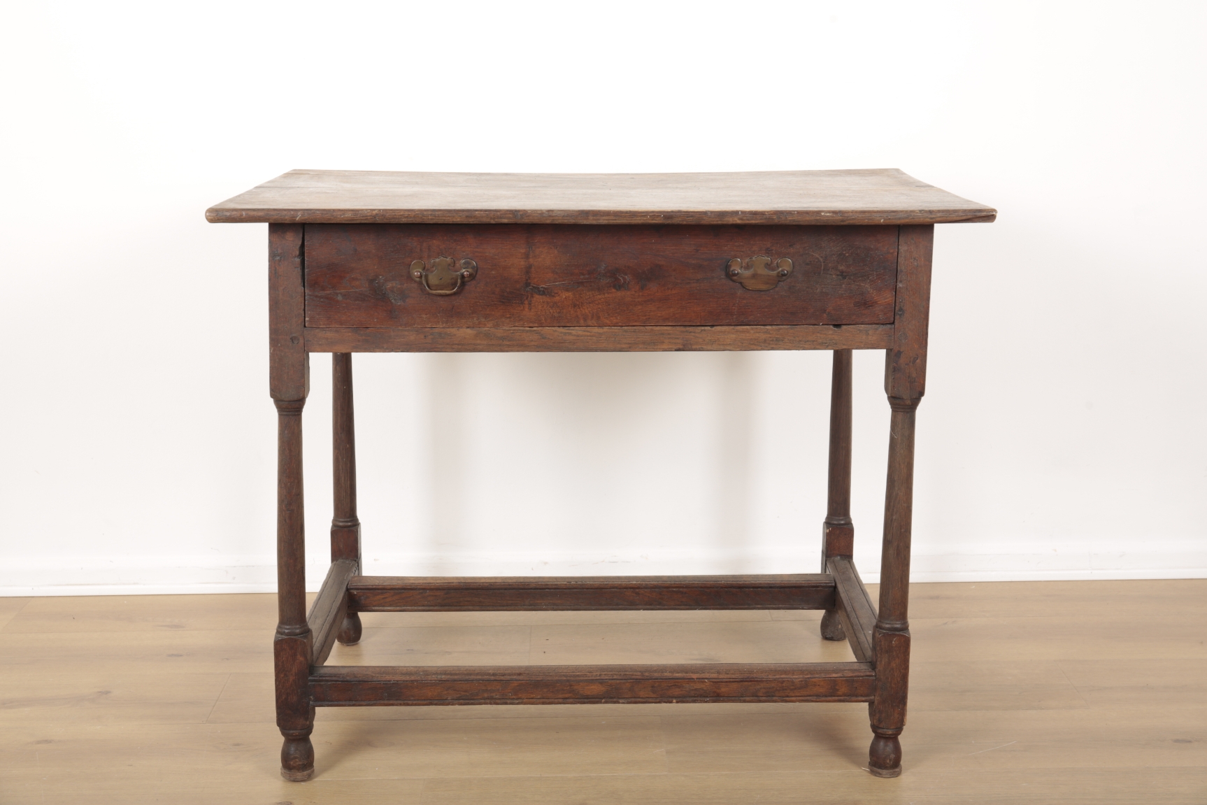 the two plank top above a singular long drawer, united by block stretchers and terminating on elongated pad feet, 75cm high x 95cm wide x 66cm deep