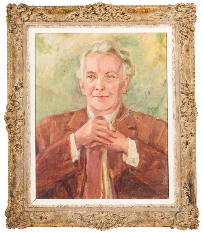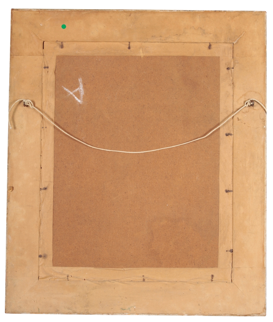 depicted seated, his hands together, oil on board, 51cm x 39cm
