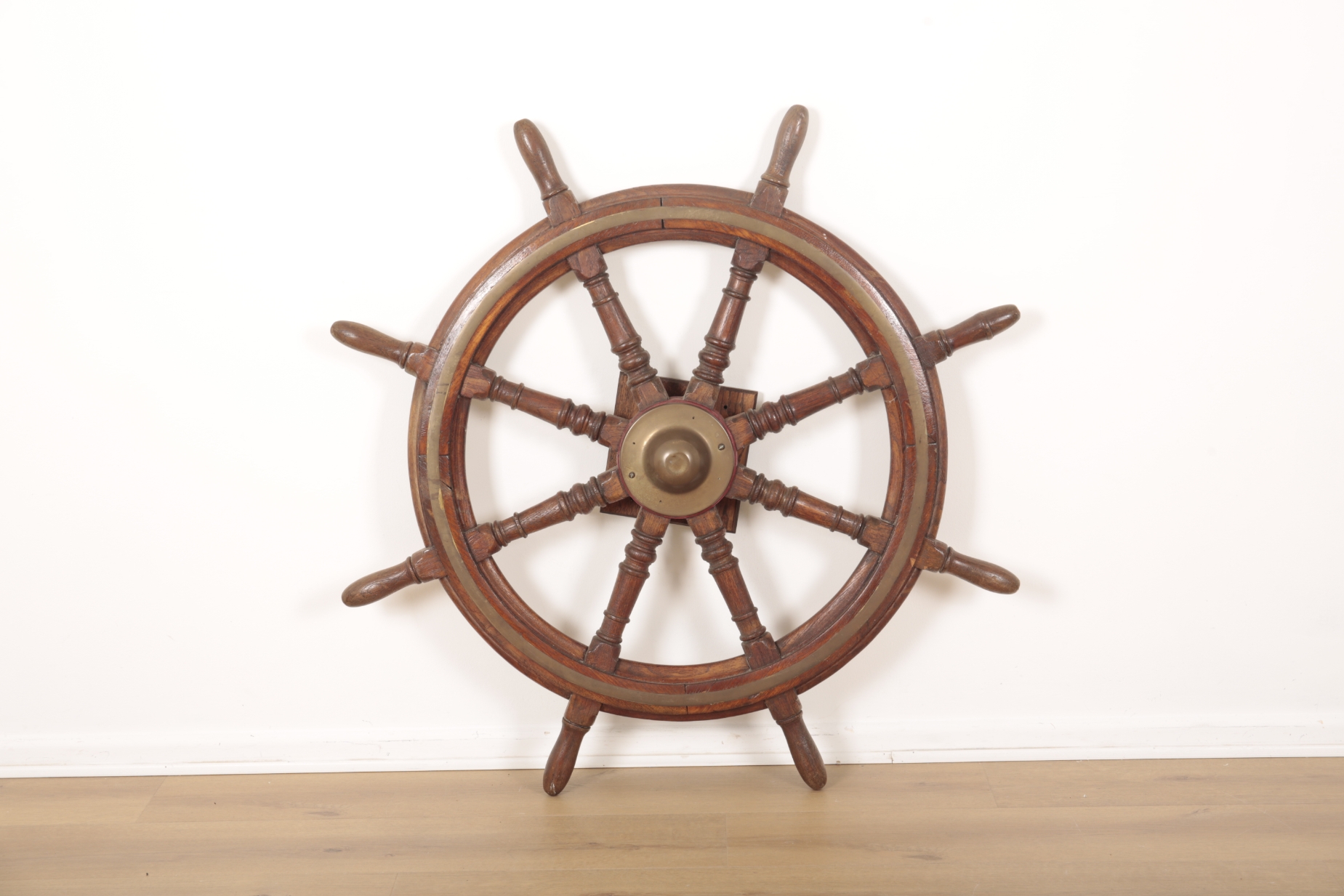 A LARGE OAK AND BRASS BOUND SHIP'S WHEEL