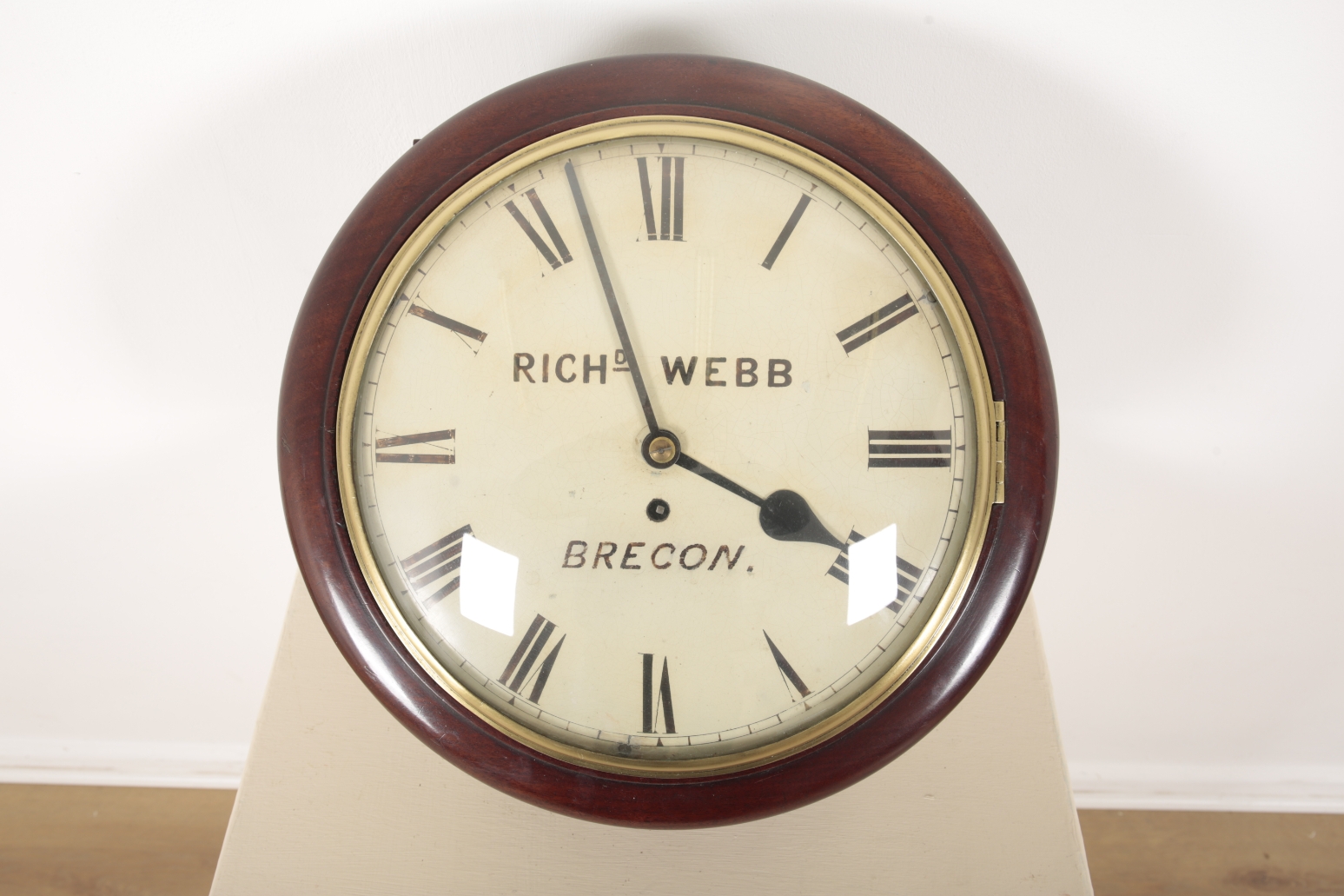 A MAHOGANY CASED FUSEE RAILWAY WALL CLOCK BY RICHARD WEBB, BRECON