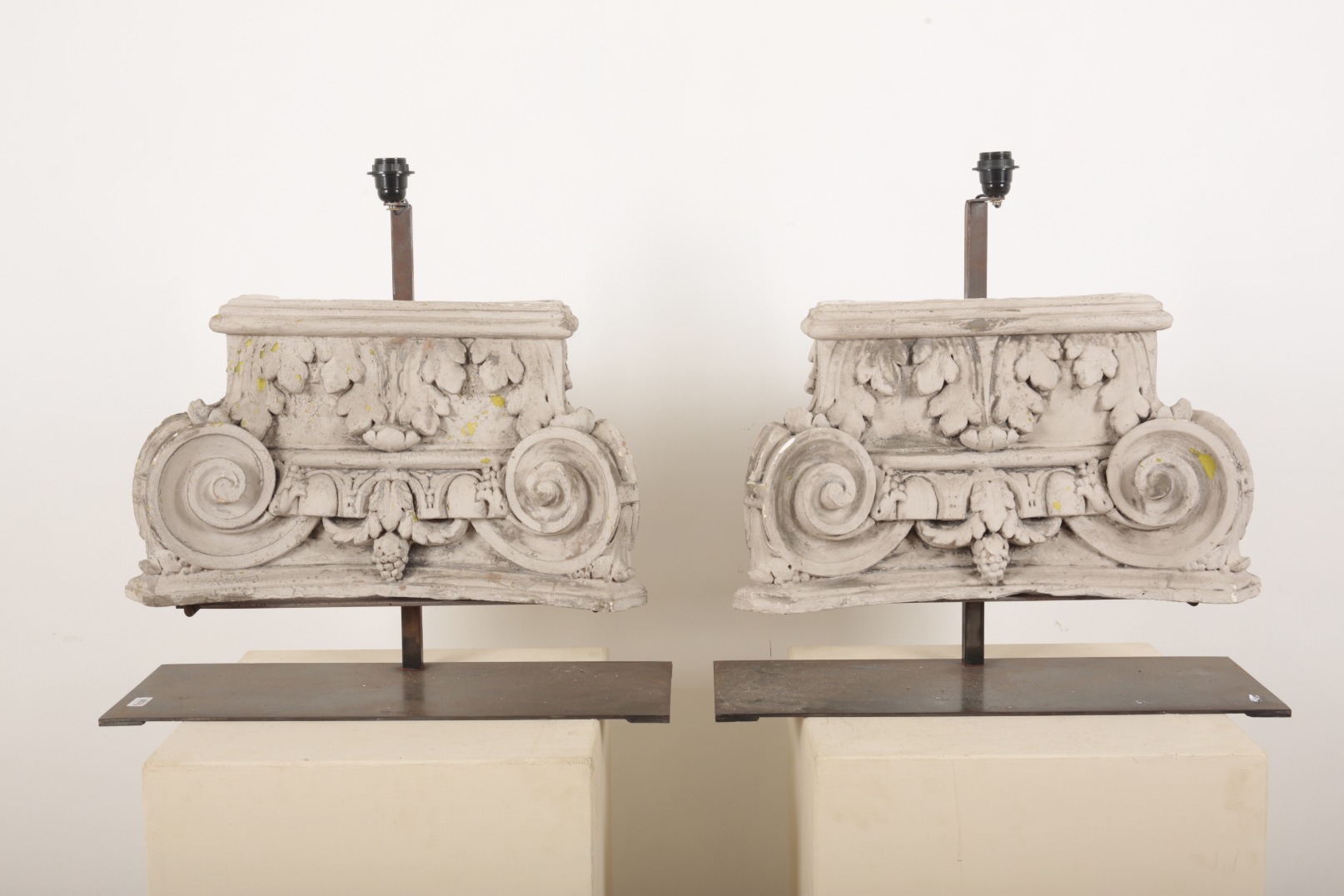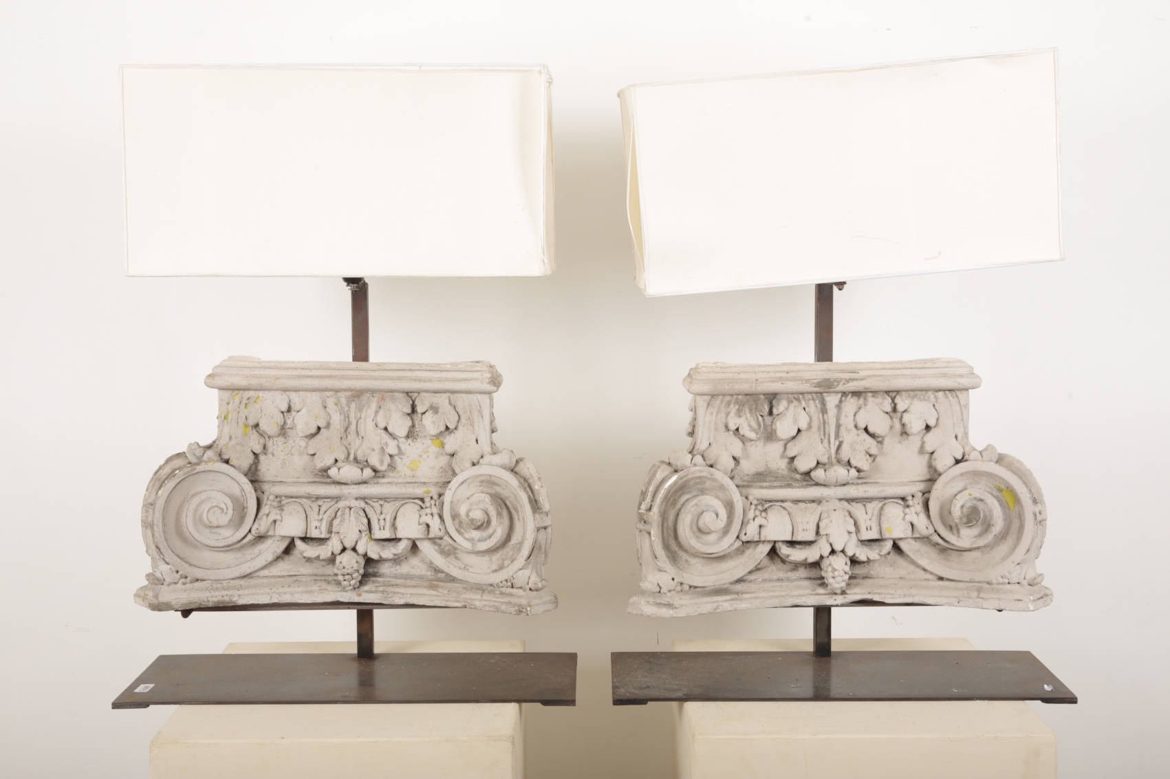 A PAIR OF PLASTER CORINTHIAN CAPITAL LAMPS WITH SHADES