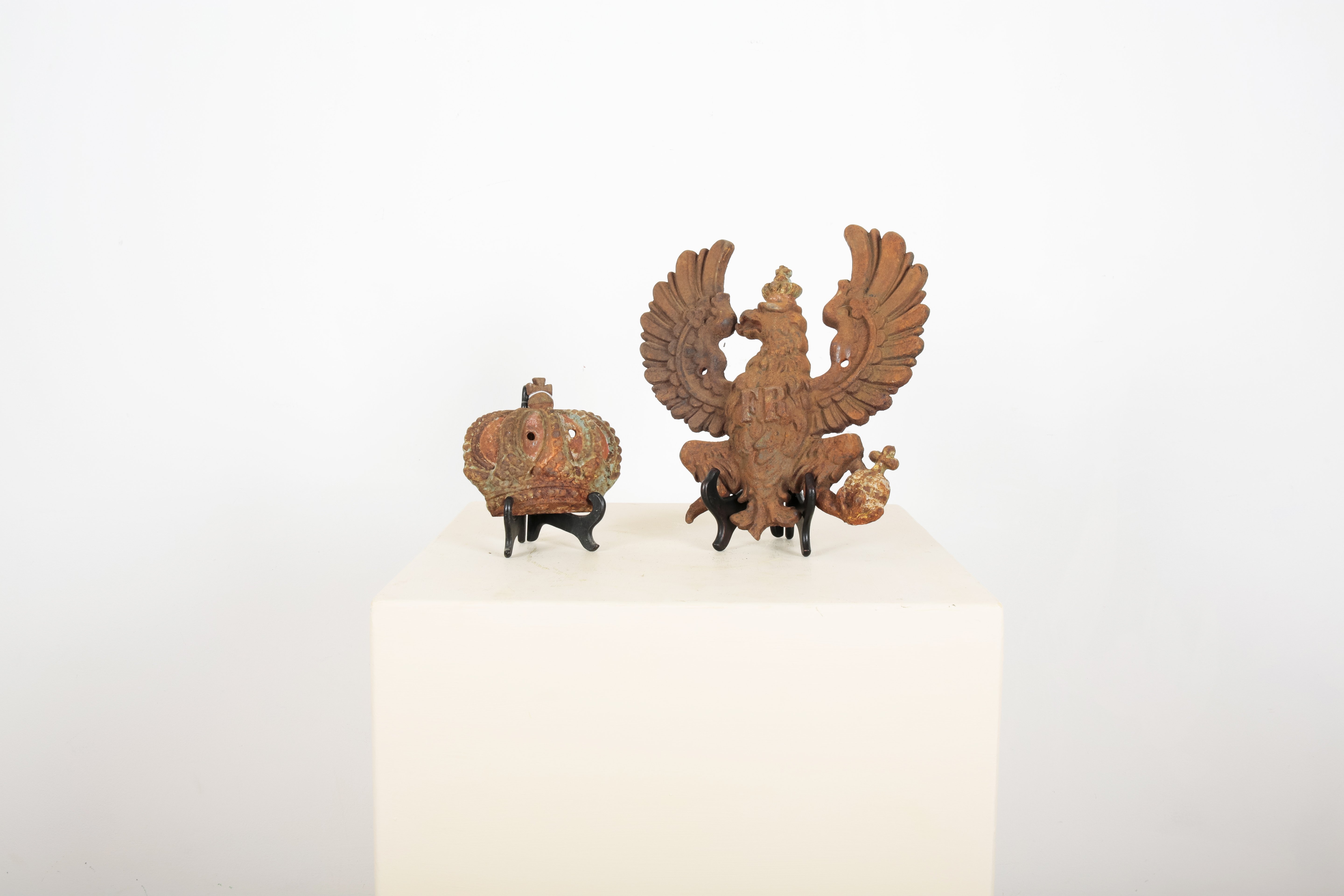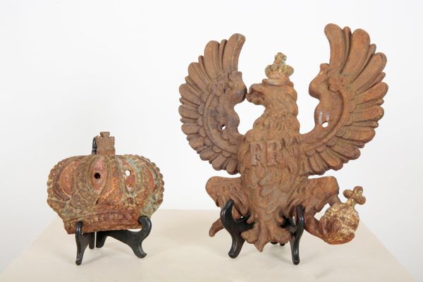 the single-headed crowned eagle holding orb in one claw (with losses), 31cm long x 21cm wide; together with a separate cast iron crown (with drill holes for wall mounting), 12cm high (2)