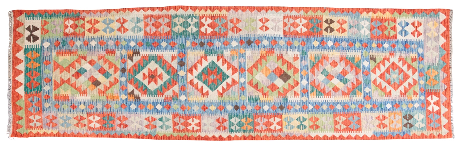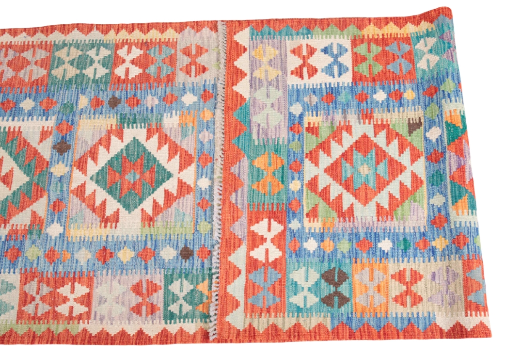 of light blue ground divided into squares containing geometric polychrome coloured jagged shapes, all within orange conforming border, 195cm x 91cm