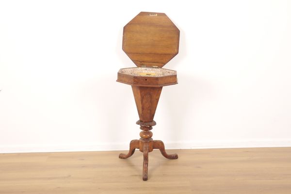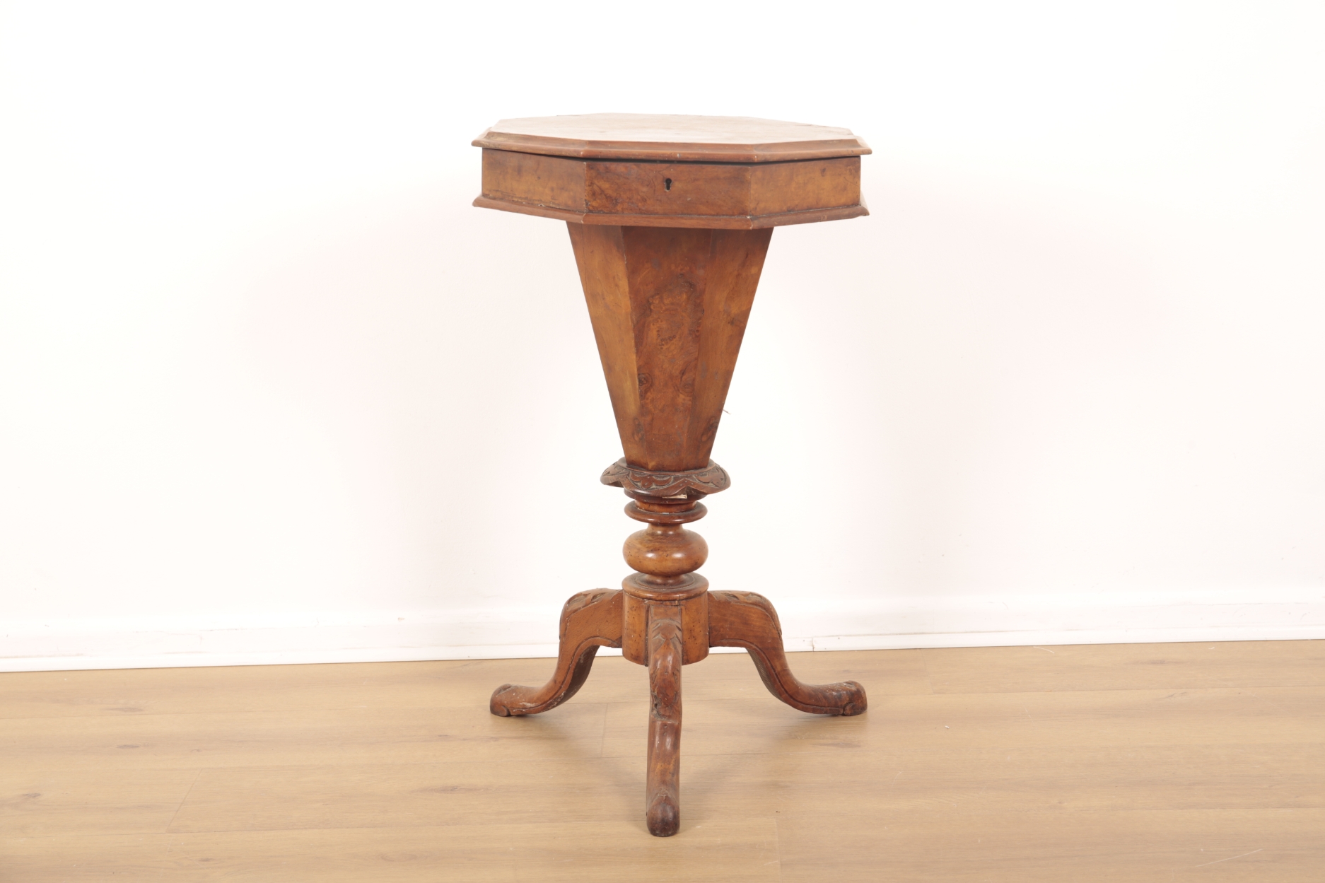 A VICTORIAN BURR WALNUT TRUMPET SHAPED SEWING TABLE