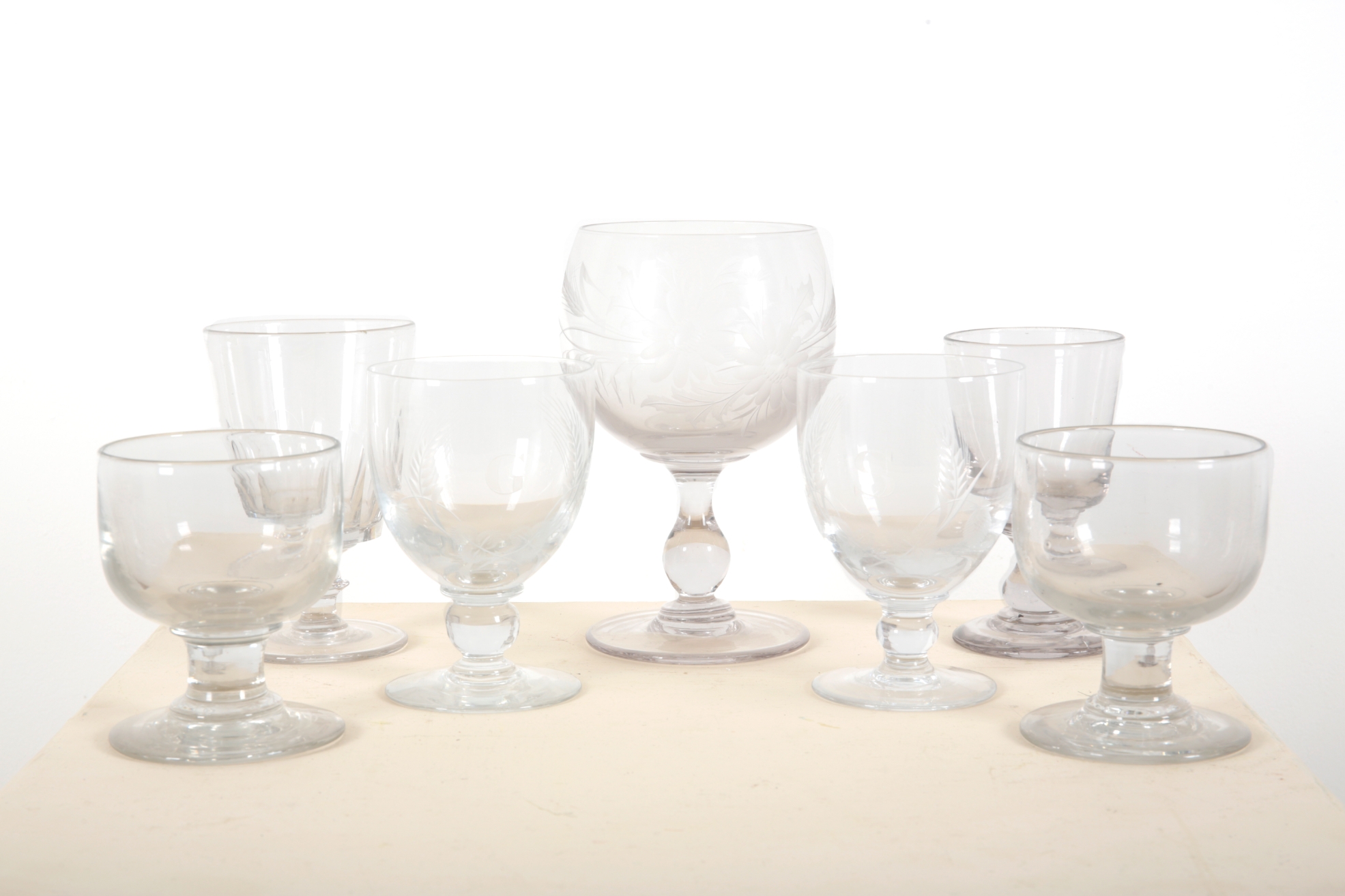 19th century and later, comprising a bucket bowl example with a balustoid stem, 15cm high, a pair of goblets, a cut glass example with bladed stem, 15cm high, a pair inscribed to the base Brierley, each engraved to the bowl with the initials 'S' and 'G' respectively, within ears of wheat, and a large example with blooming flora engraved to the ovoid bowl, 20cm high (7)