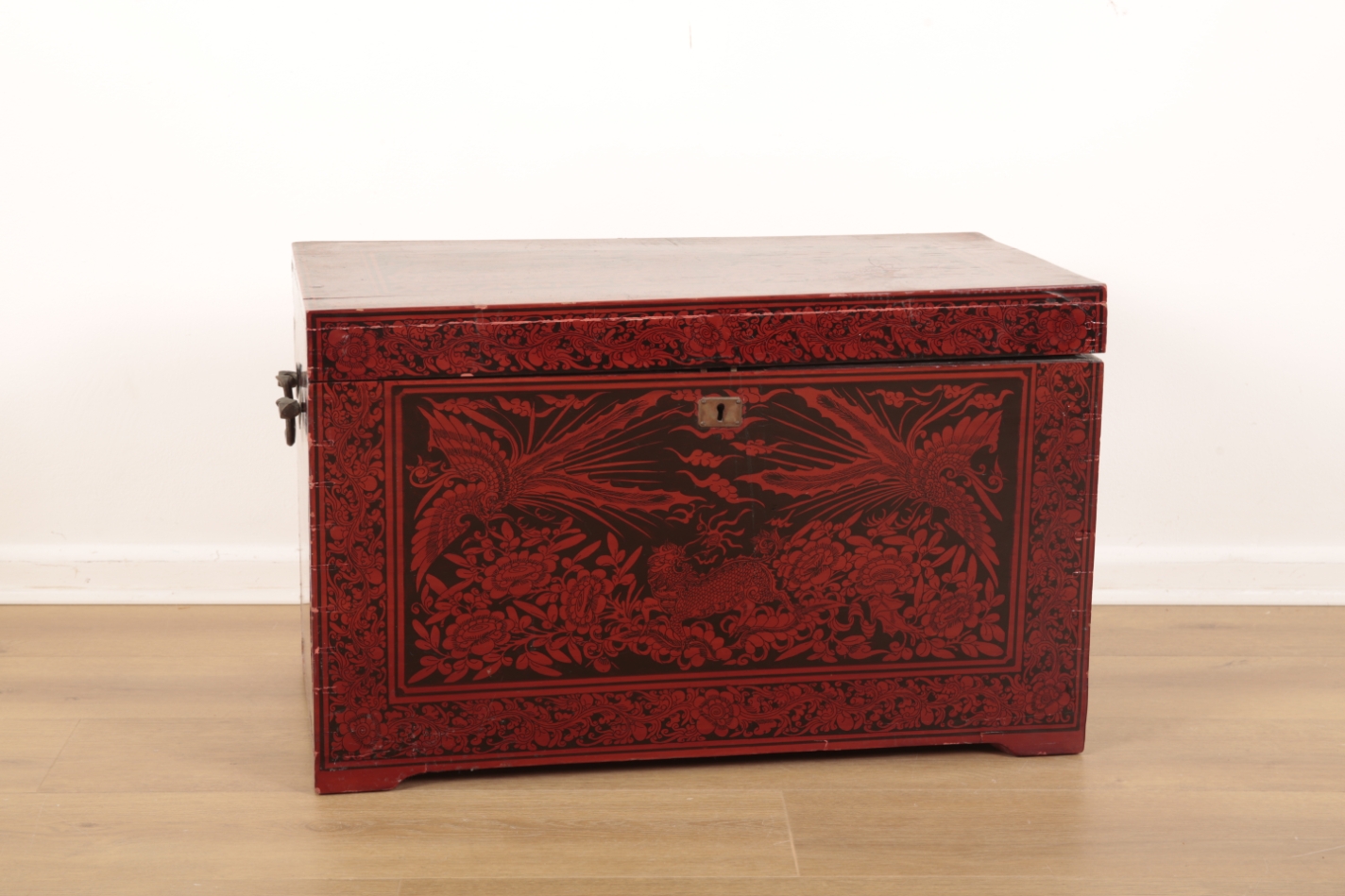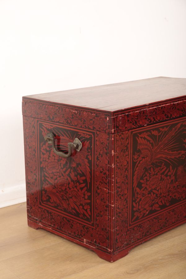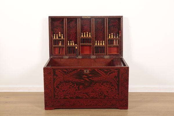 20th century, profuse floral decoration throughout and opening to reveal a conforming interior with a candlebox above a bank of drawers, 44cm high x 70cm wide x 40cm long