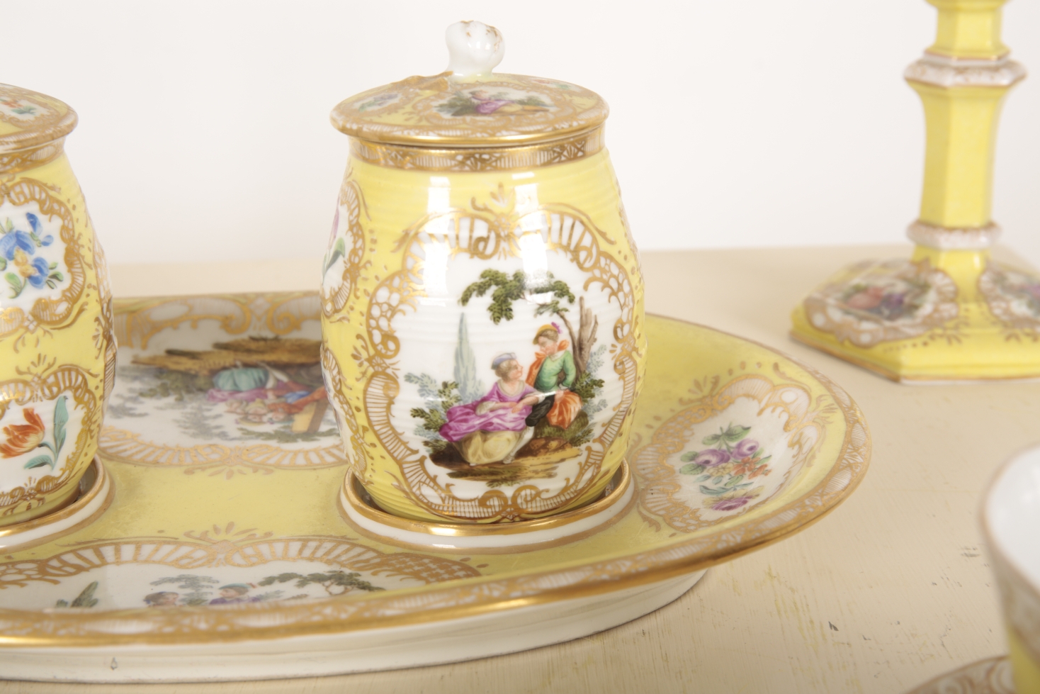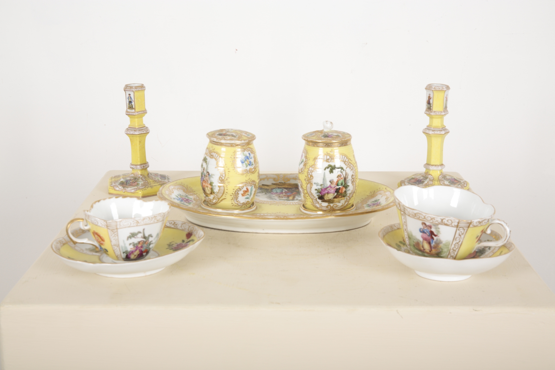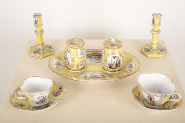 19th/20th century, underglaze blue sceptre mark to the base, of hexagonal form decorated with cartouches of courting couples, 14cm high x 8.5cm diameter; together with an ink stand, underglaze blue 'AR', decorated throughout with cartouches enclosing floral sprays and aristocratic figures on a yellow ground, 12cm high x 27cm long x 20cm wide; and two similar cups and saucers (5)