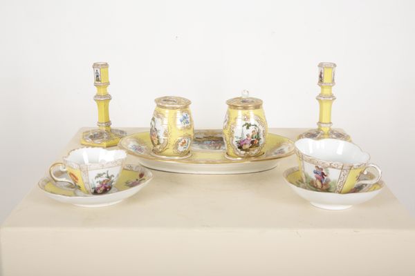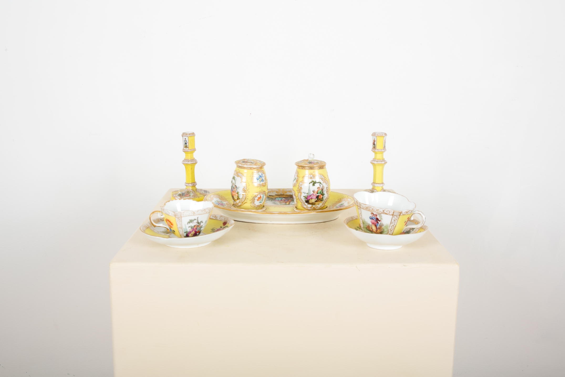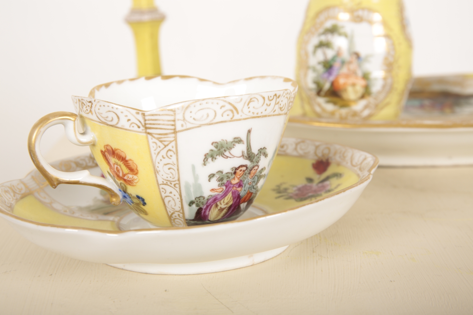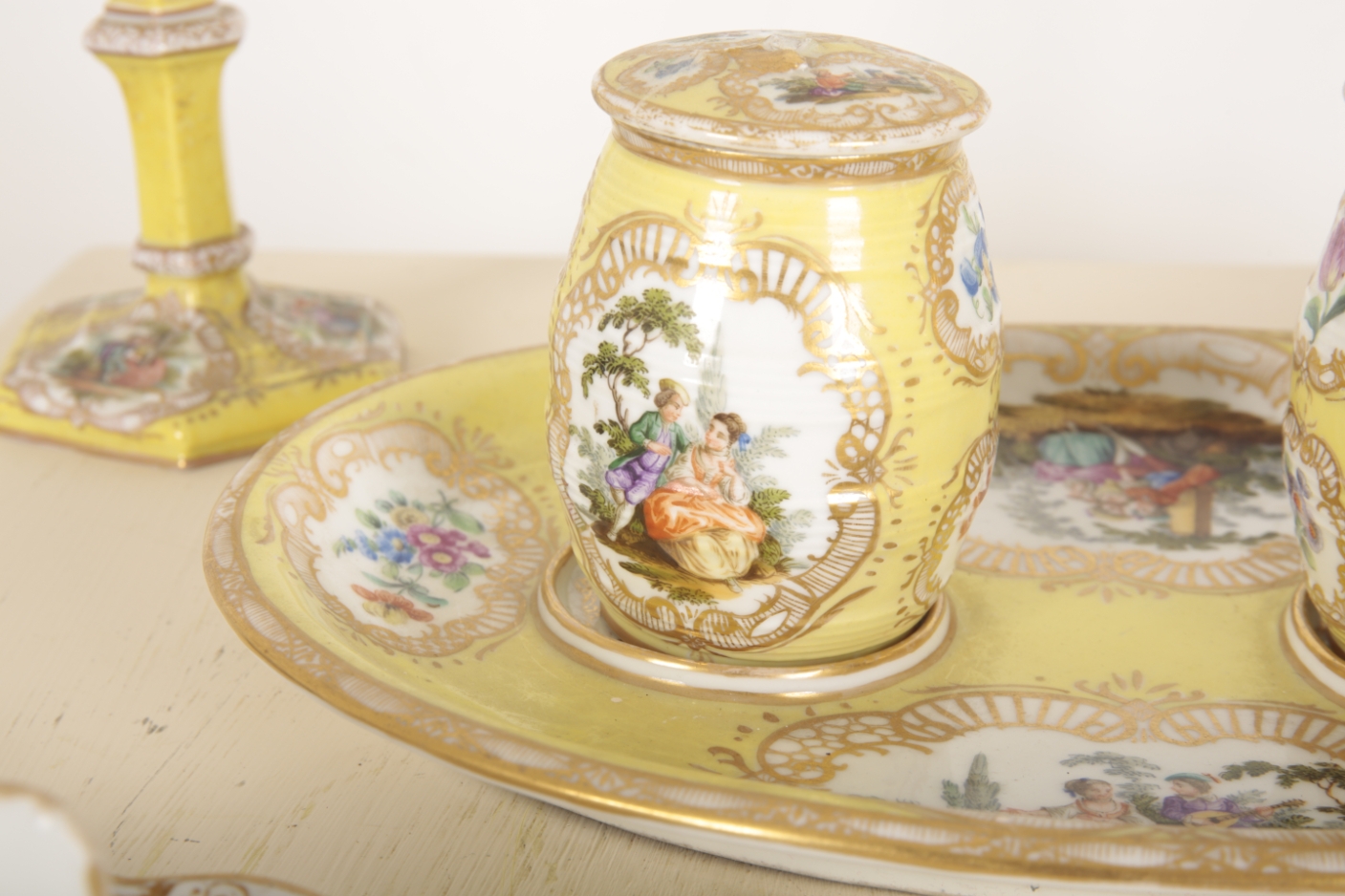 19th/20th century, underglaze blue sceptre mark to the base, of hexagonal form decorated with cartouches of courting couples, 14cm high x 8.5cm diameter; together with an ink stand, underglaze blue 'AR', decorated throughout with cartouches enclosing floral sprays and aristocratic figures on a yellow ground, 12cm high x 27cm long x 20cm wide; and two similar cups and saucers (5)