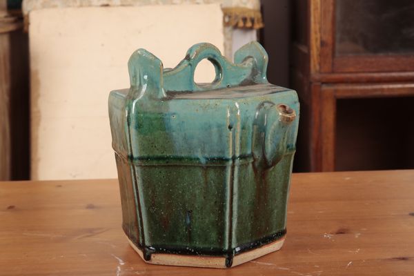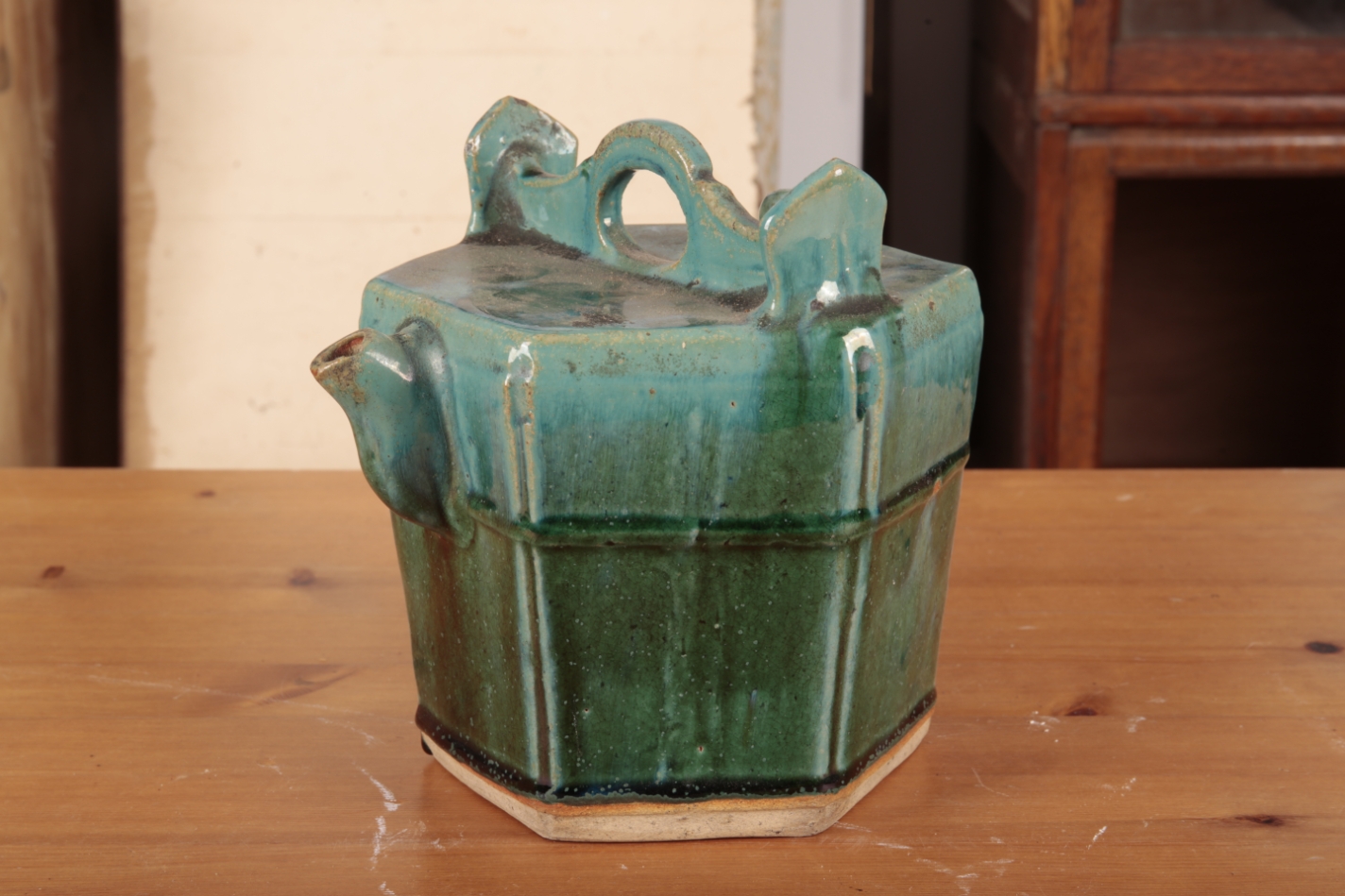 18th century, with floral finial, the body decorated with vases of flowers, 16cm high; together with a Chinese celadon earthenware hexagonal teapot of Archaistic design, 20cm high (2)