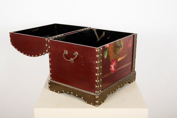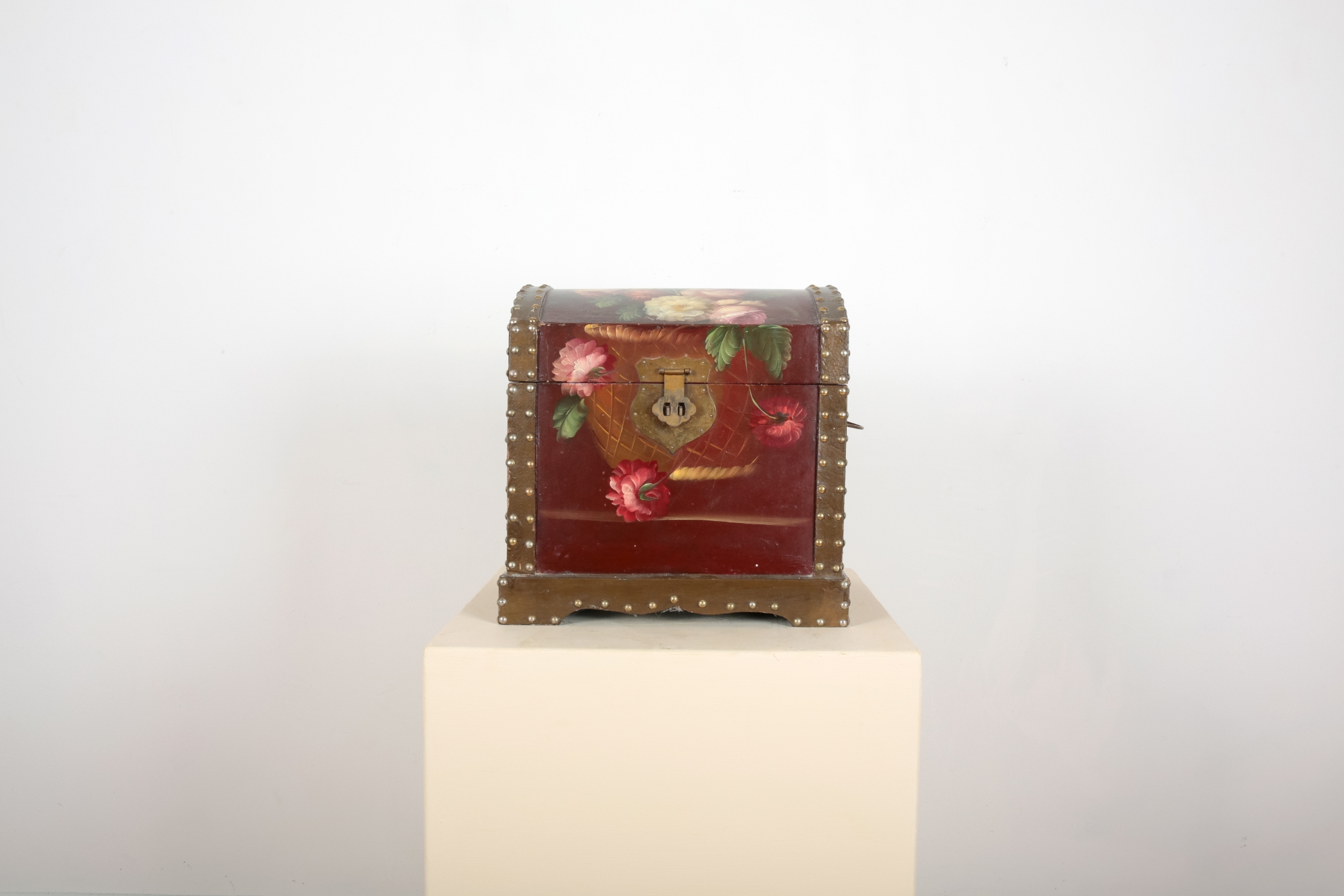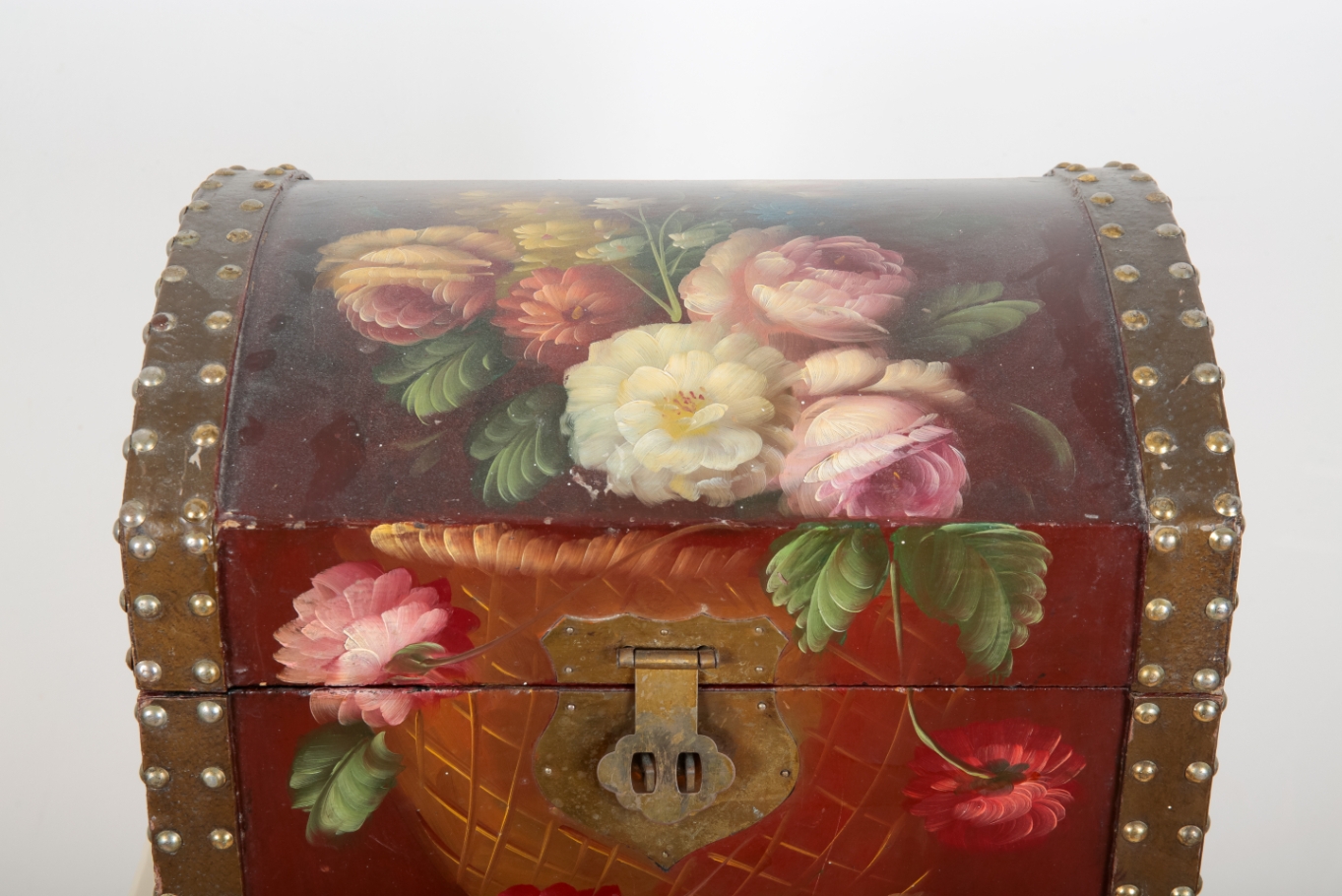 20th century, decorated with a basket of roses to the lid and front, with carrying handles to the sides, 38cm high x 38cm long x 30cm deep