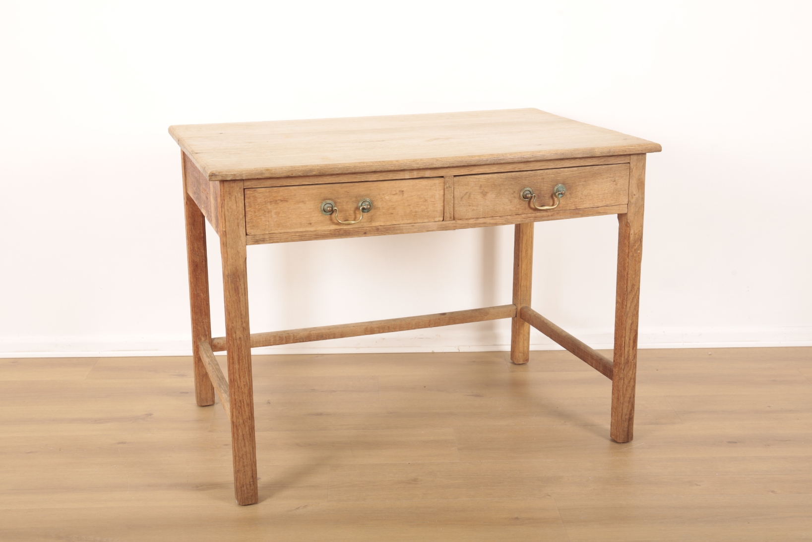 with two drawers to one side, the chamfered block legs united by stretchers, 77.5cm high x 106cm wide x 67cm deep