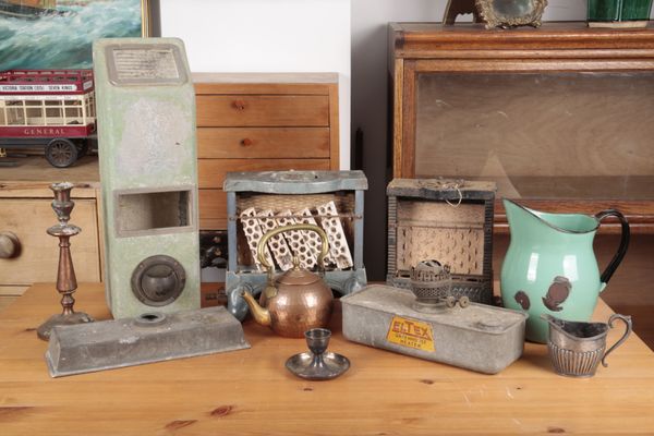 78cm high x 58cm wide x 20cm deep, with burner; together with a set of Victorian cast iron scales by Bartlett of Bristol, with brass pan; and a large collection of decorative enamelled and other metalware including fuel cans (a lot)