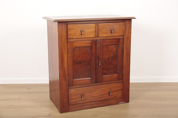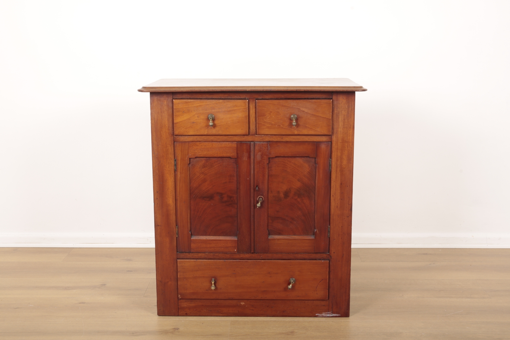 19th century and later, the moulded curve edged top above two small drawers, with two panelled doors (missing shelf inside) beneath and one long drawer below, 79cm high x 73.5cm wide x 44.5cm deep