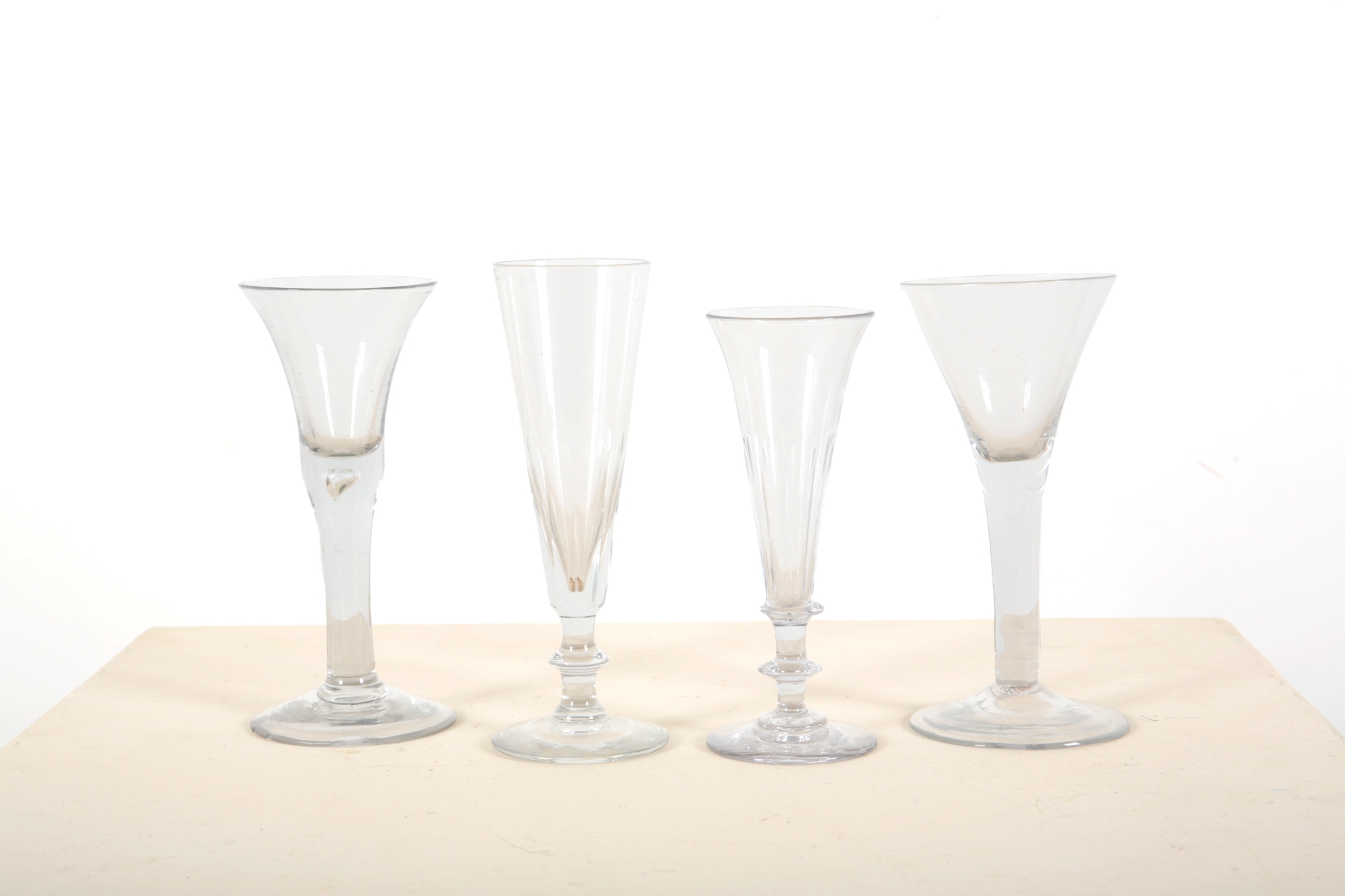 the first 18th century example with a drawn trumpet bowl over teared stem and conical foot, the other with a plain stem, 17cm high; together with two cut glass champagne flutes, 16cm high (4)