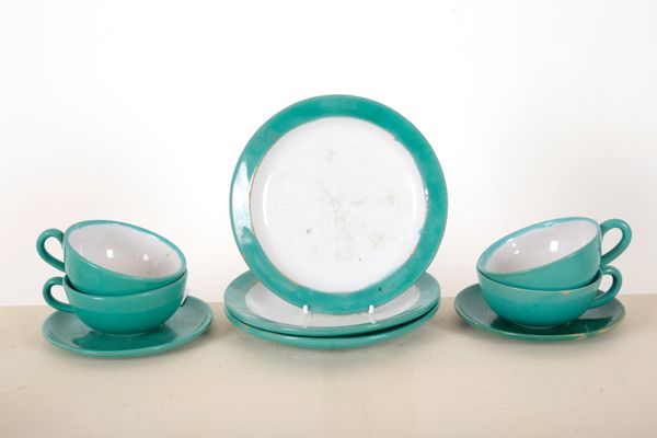 the cup with solid handle; together with a similar lidded honey pot and saucer by the maker; a wooden honey dipper; and a turquoise glazed part tea service (16)