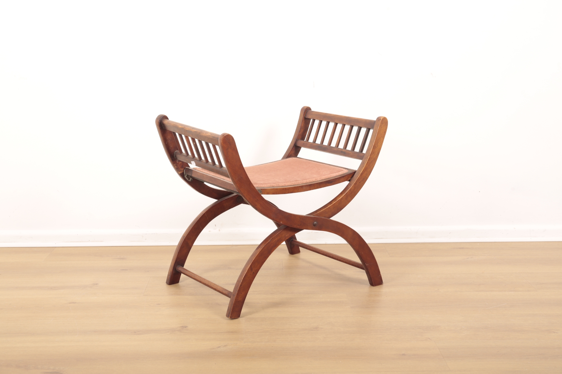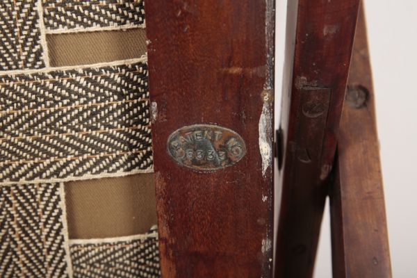 with patent number to underside, with pink damask upholstery to seat, 57cm high x 63cm wide x 47cm deep
