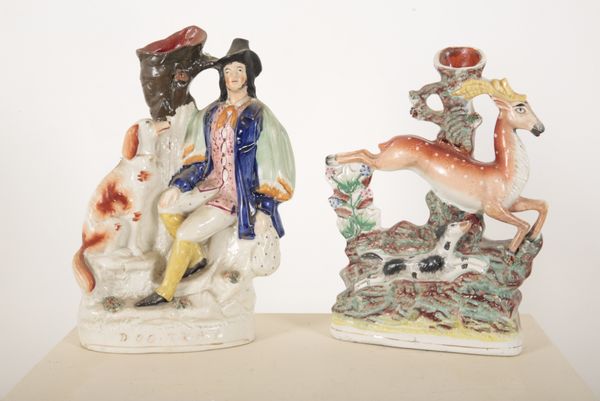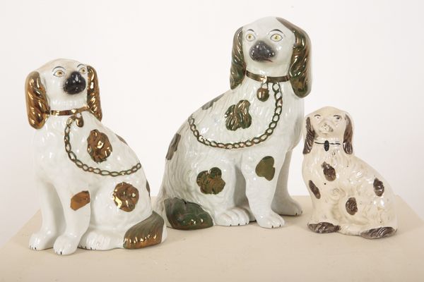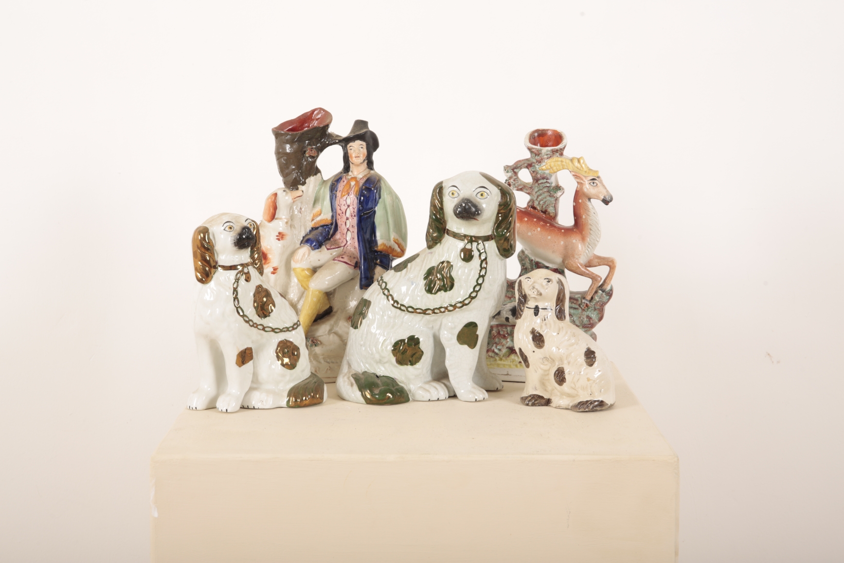 19th century, one of a stag being chased by a dog (old repair) and another of a seated man with his spaniel; together with three King Charles spaniels of varying sizes, the tallest spill vase, 31cm high x 19cm wide x 10cm deep (5)