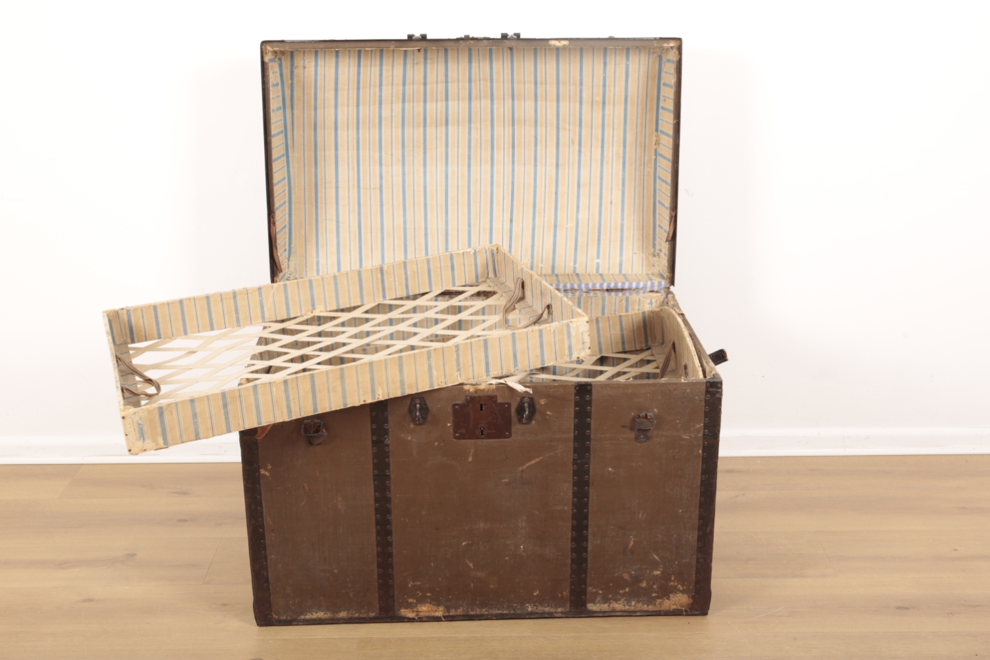 early 20th century, iron bound strapwork and carrying handles, the interior complete with webbing and trays, 75cm high x 86cm wide x 55cm deep